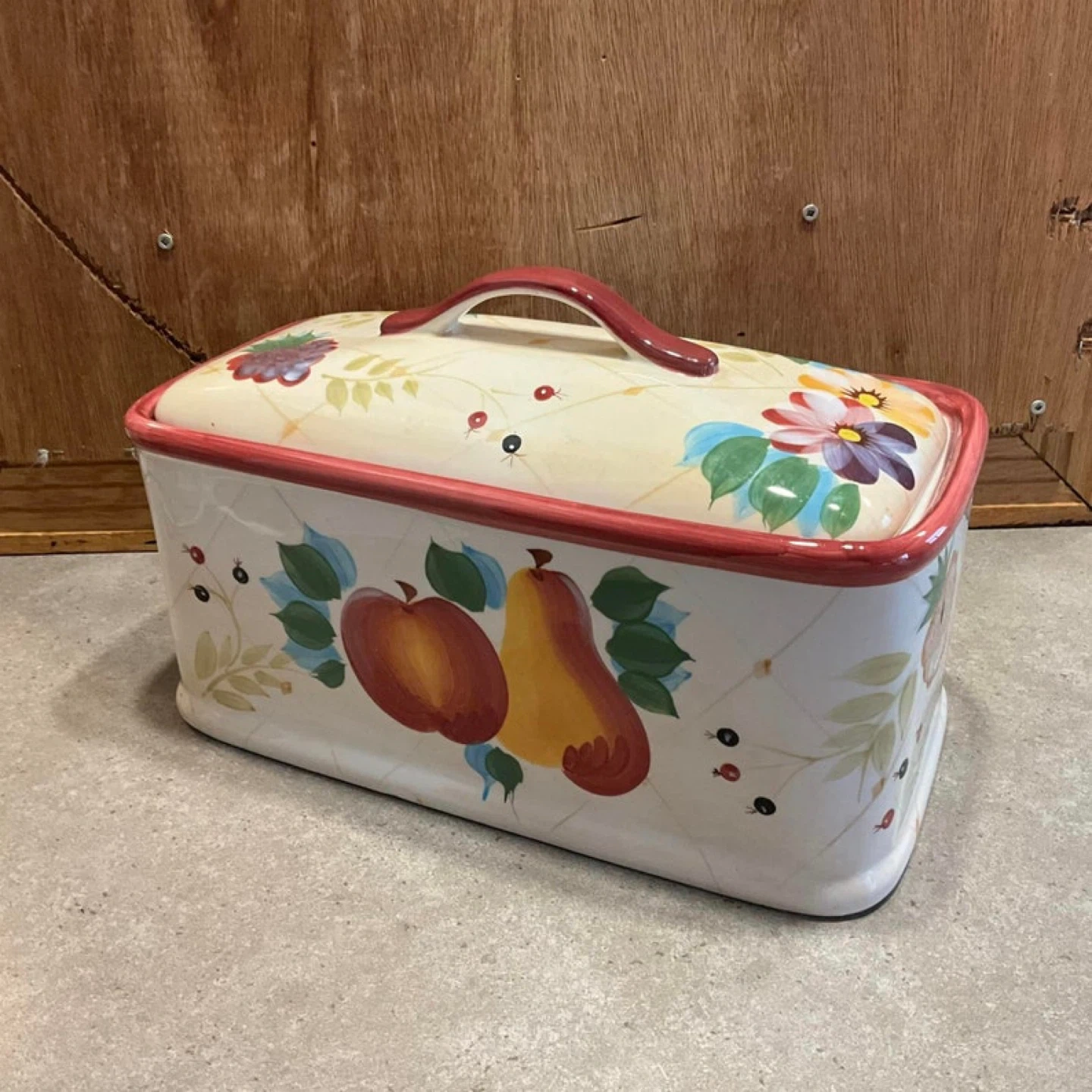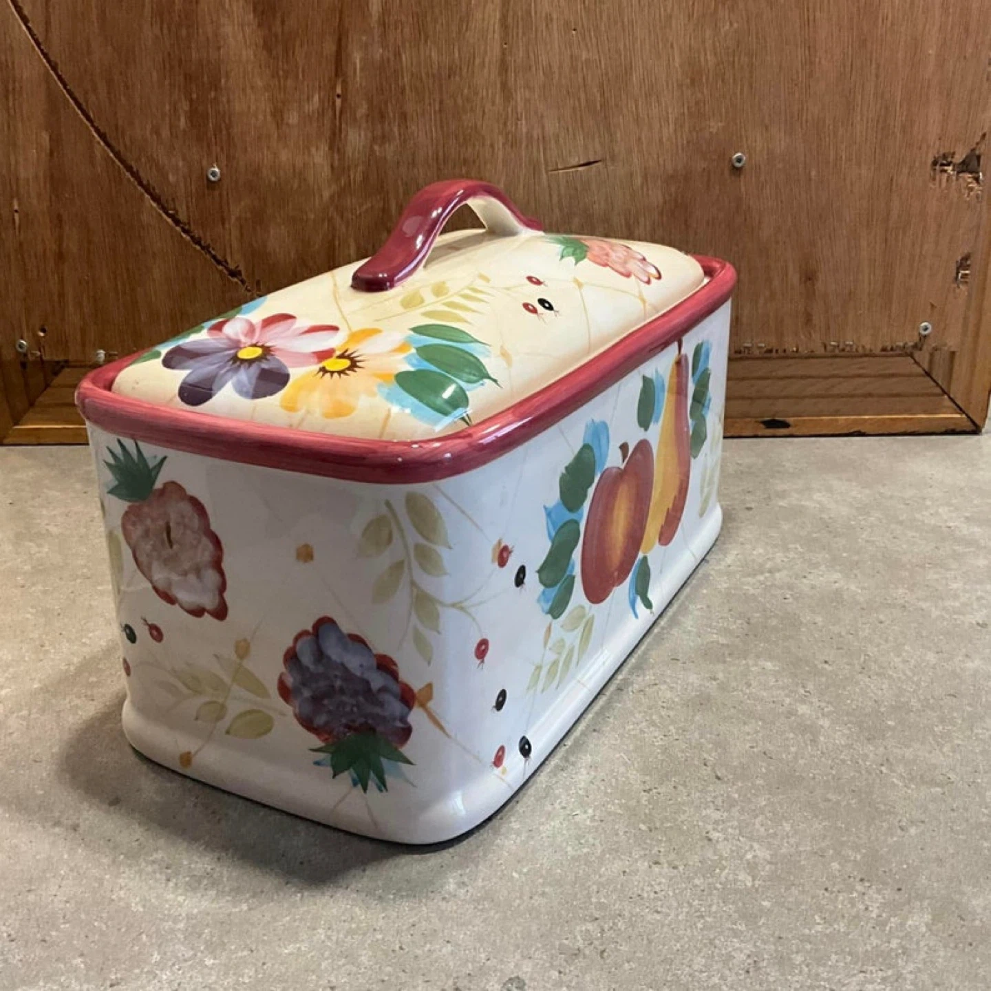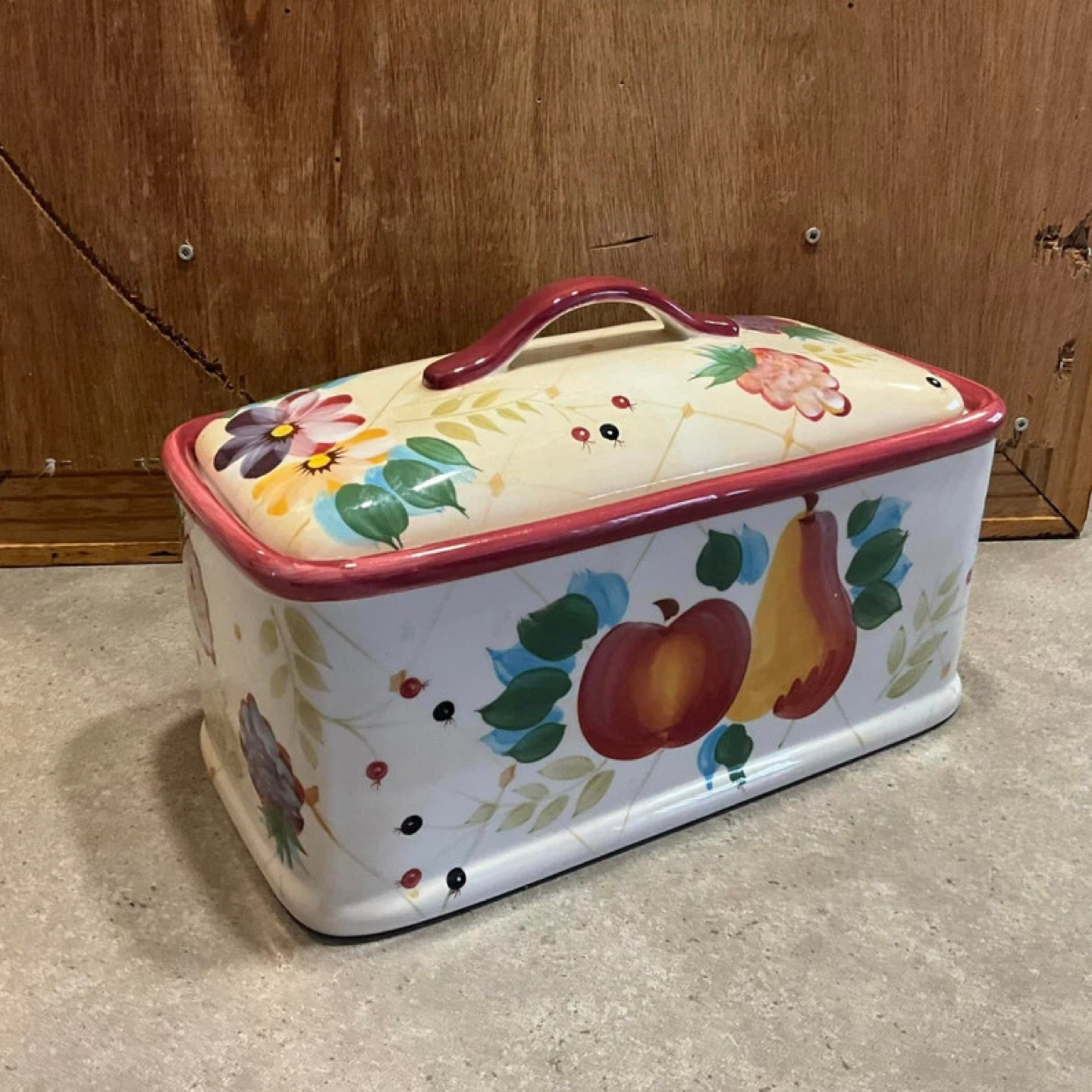 Ceramic bread box with a lovely floral and fruit design! It's in great shape and ready to keep your bread fresh. Perfect for adding a touch of charm to your kitchen countertop