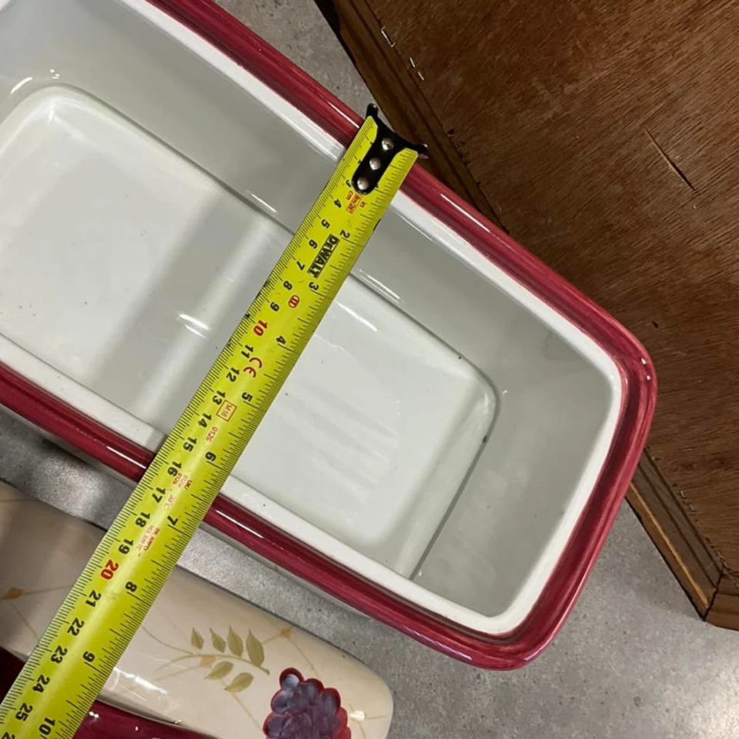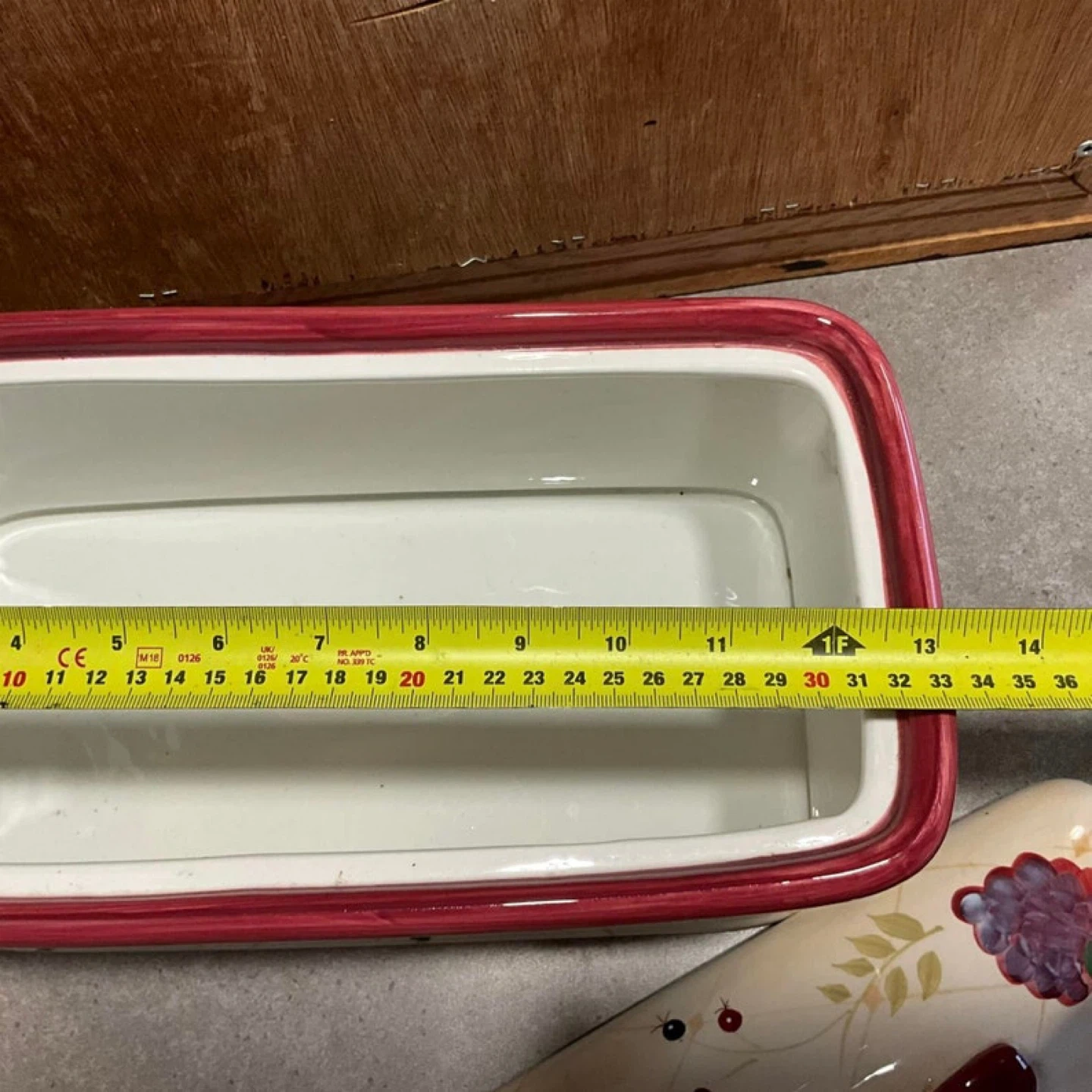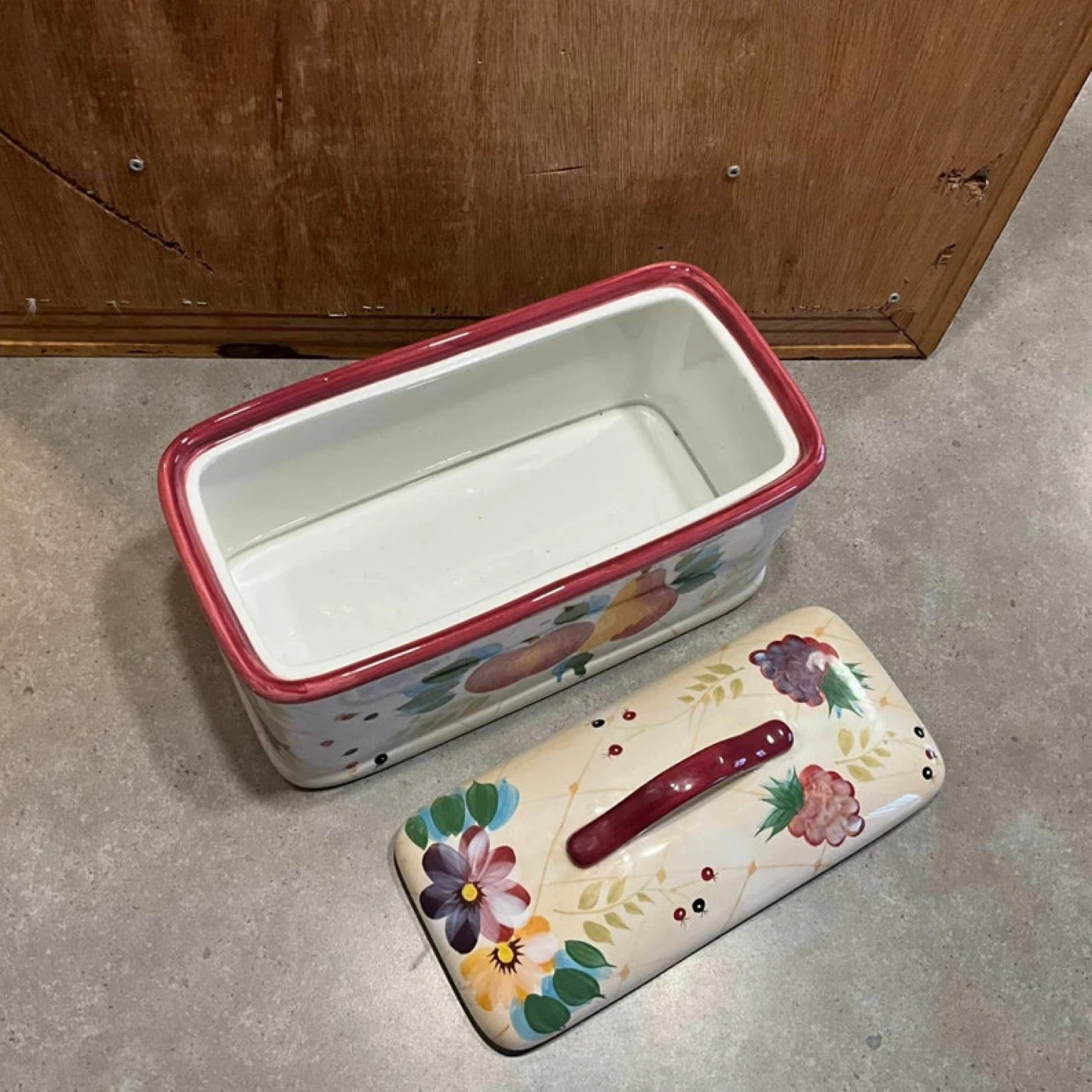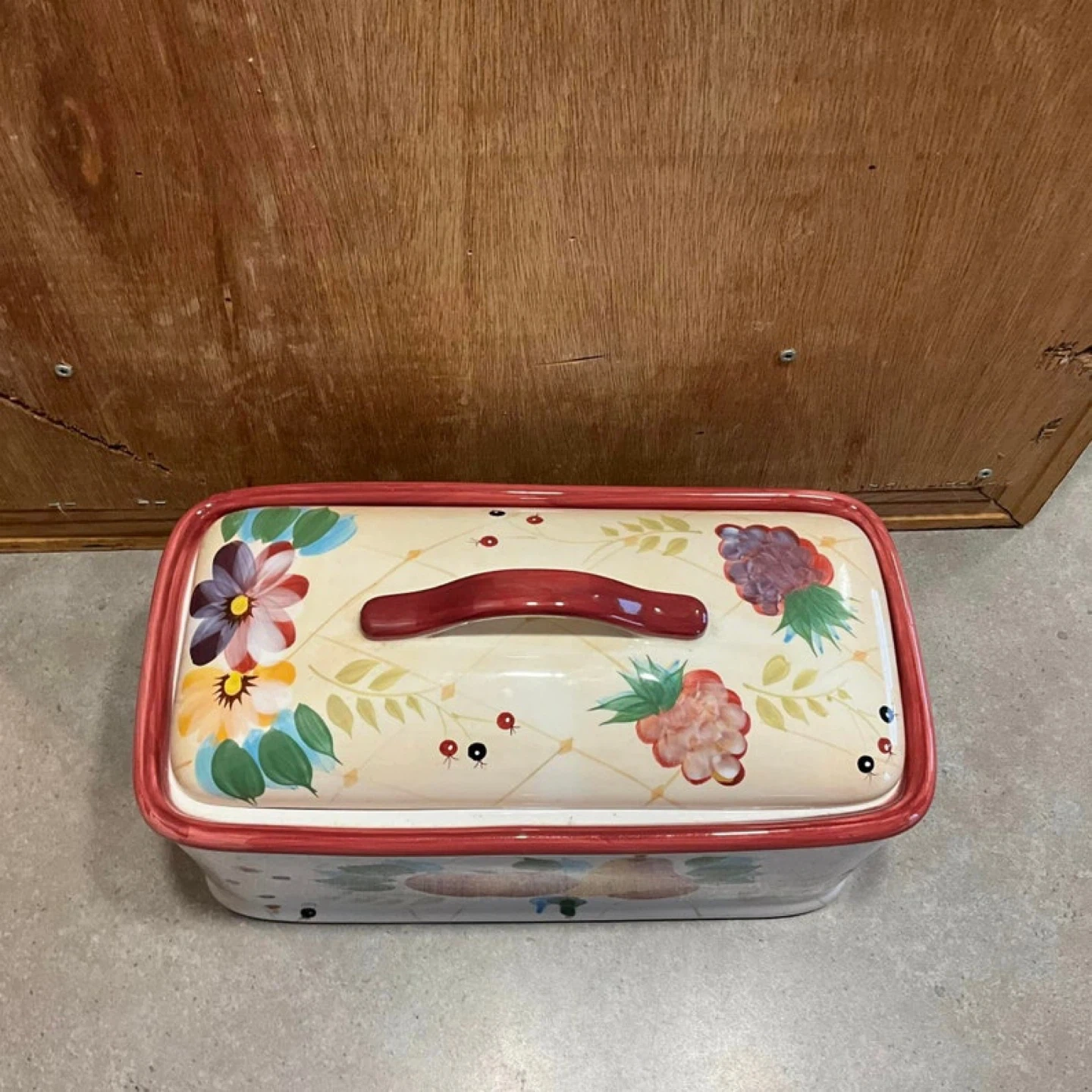 Ceramic bread box with a lovely floral and fruit design! It's in great shape and ready to keep your bread fresh. Perfect for adding a touch of charm to your kitchen countertop