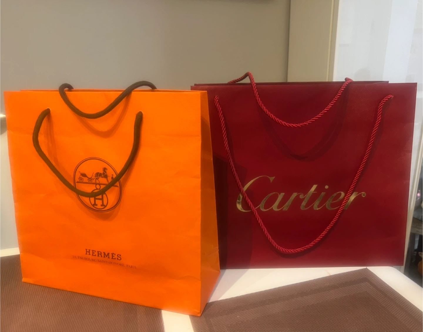 Selling two paper shopping bags from Hermès and Cartier. $9 each, or take both for $15. Shows some crease from storage hence reflected on price. Perfect to add a touch of luxury to your storage solutions or gifts.