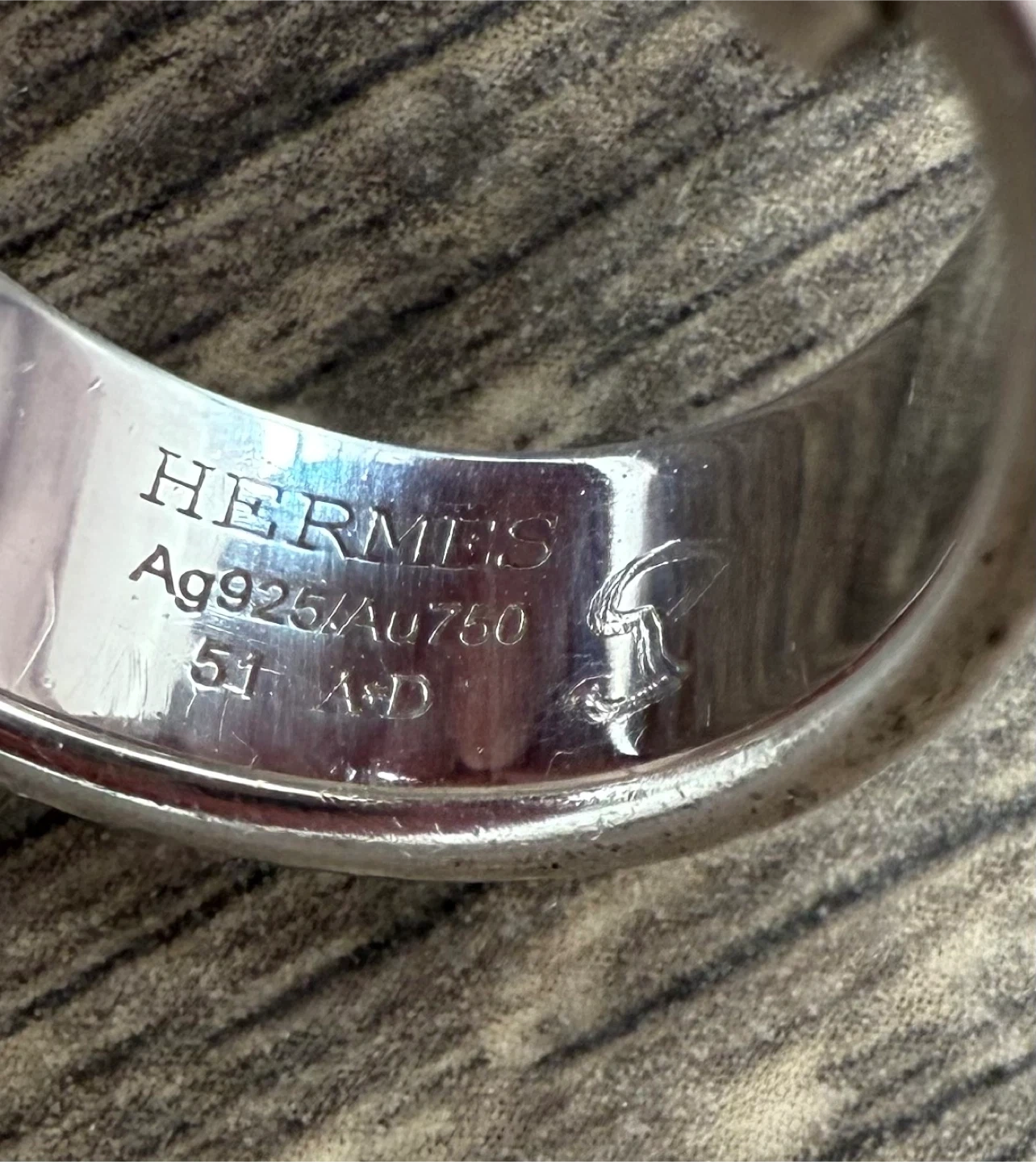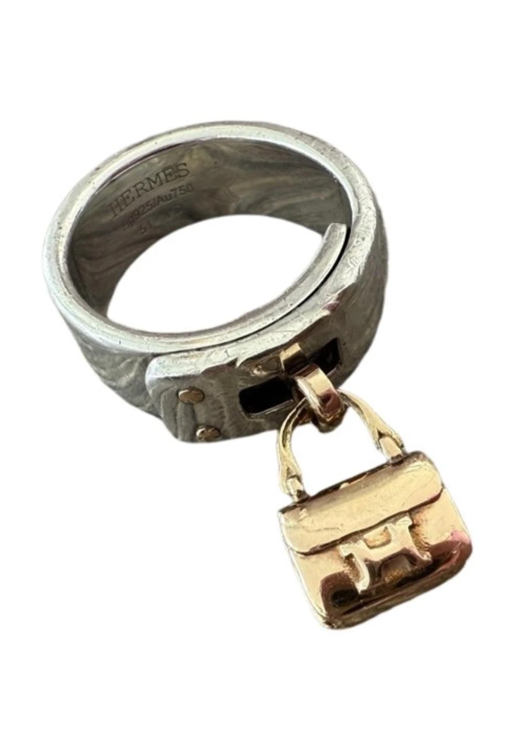 Selling a unique Hermes ring! It features a silver band and a cute gold Constance handbag charm. The ring is size 51 and is made of Ag925/Au750. It's a beautiful piece to add to your collection!
