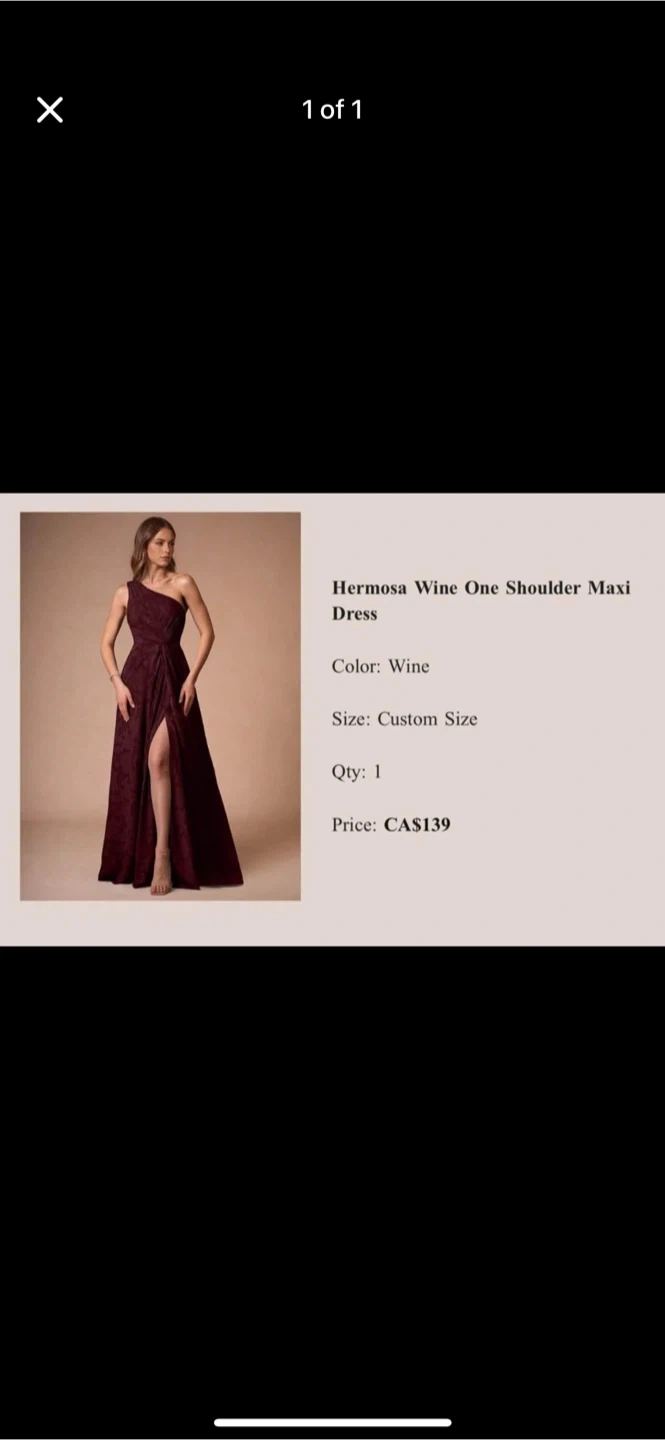 Selling a beautiful Hermosa one-shoulder maxi dress in a lovely wine colour. It's a custom size and originally cost CA$139