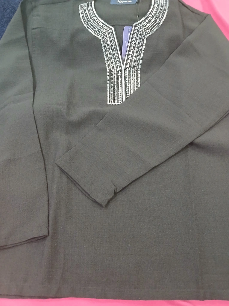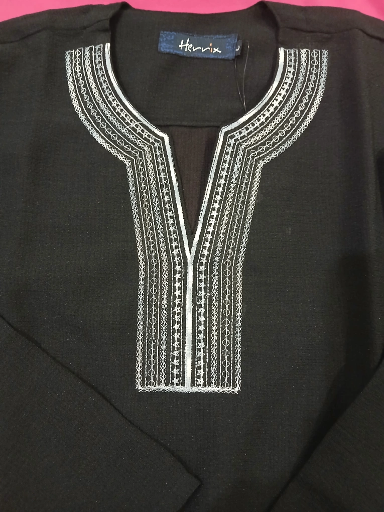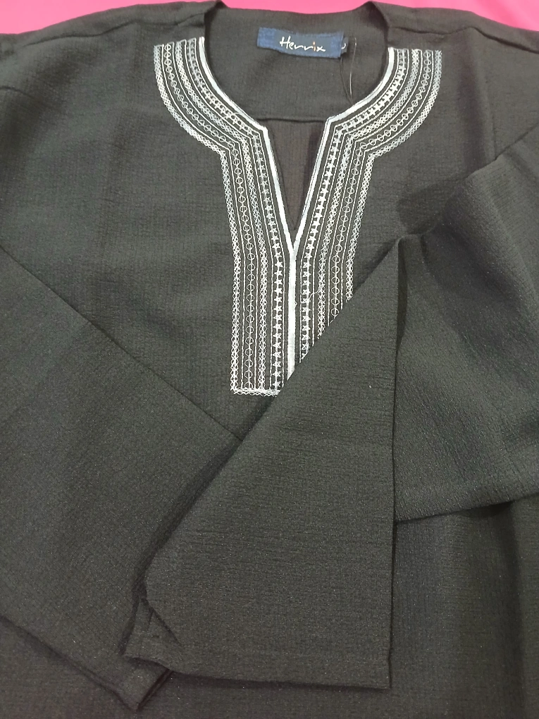 I'm selling a Herrix long-sleeve top in black. Size is Large and It features a unique embroidered design around the neckline. Great for hot Summers.
