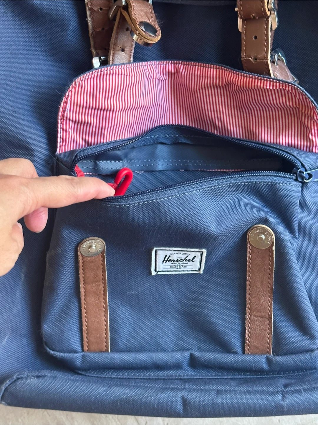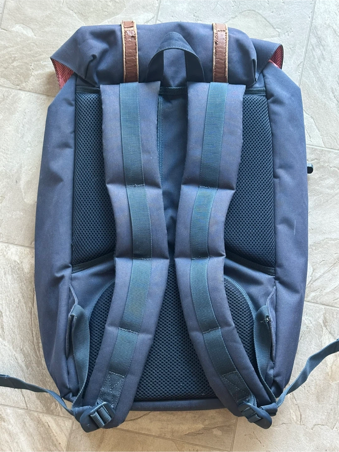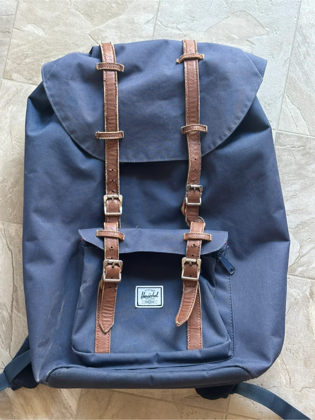Selling a Herschel backpack in blue. It's in fair condition and has a few signs of wear on the leather straps. However it is not visible from the front. One magnetic button is off, but you can glue it back. However, no holes or no major wear on the bottom or the back of bag. Both shoulder straps are in excellent condition It is still can be used for quite some time!