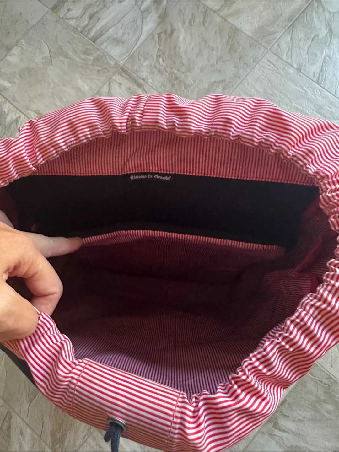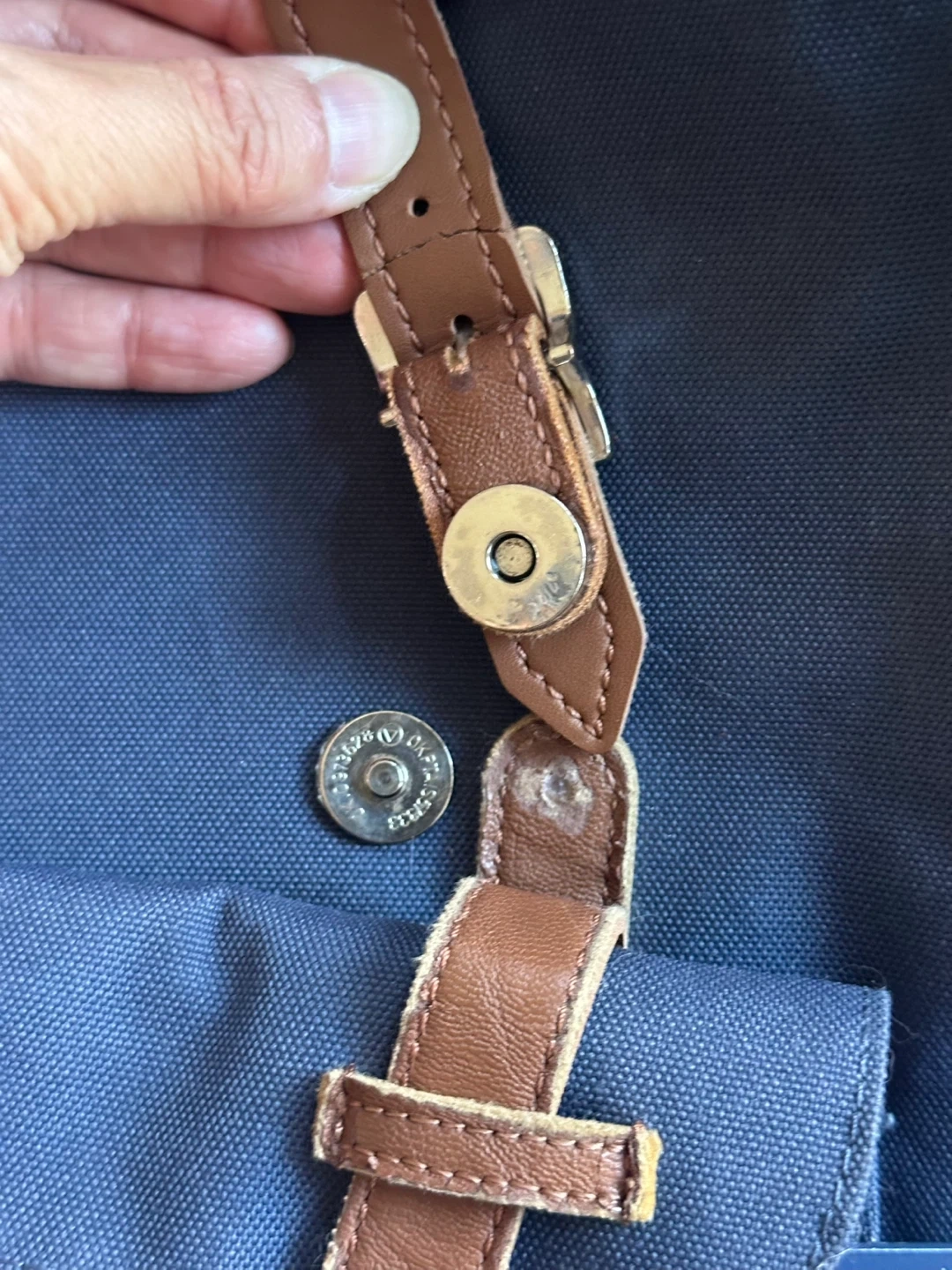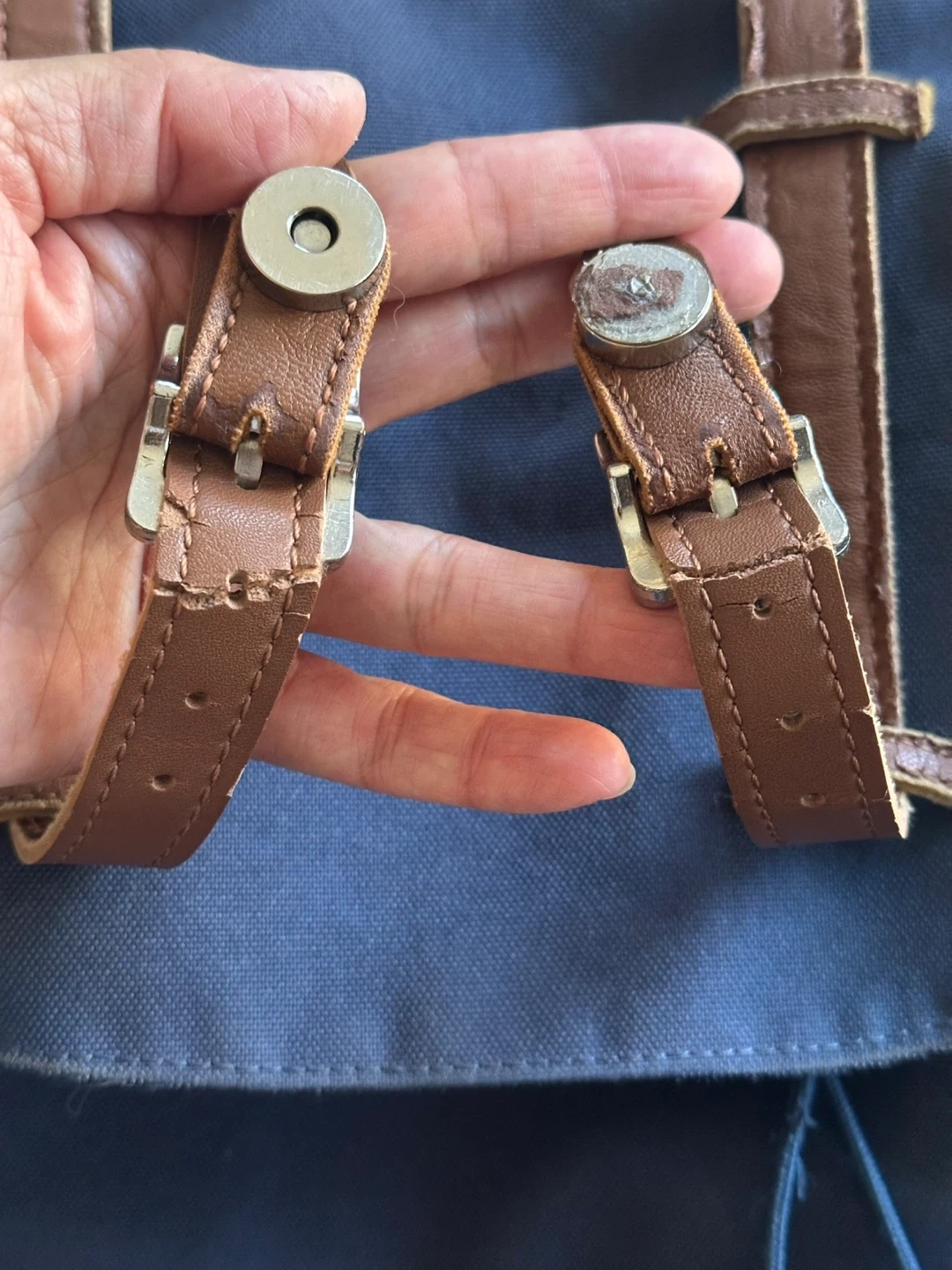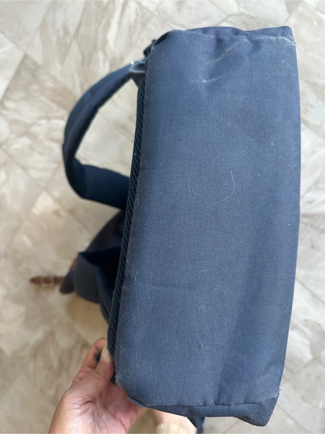 Selling a Herschel backpack in blue. It's in fair condition and has a few signs of wear on the leather straps. However it is not visible from the front. One magnetic button is off, but you can glue it back. However, no holes or no major wear on the bottom or the back of bag. Both shoulder straps are in excellent condition It is still can be used for quite some time!