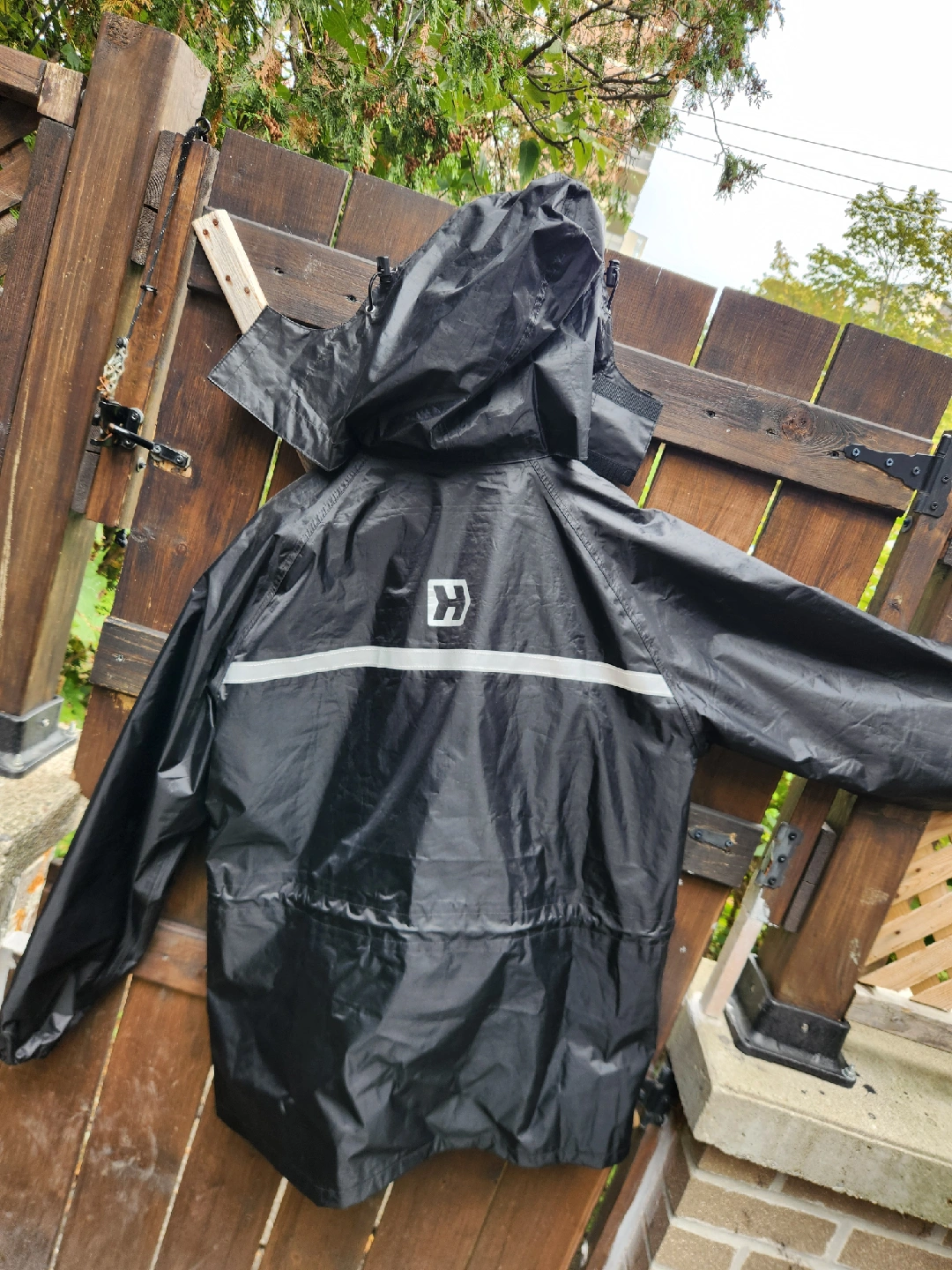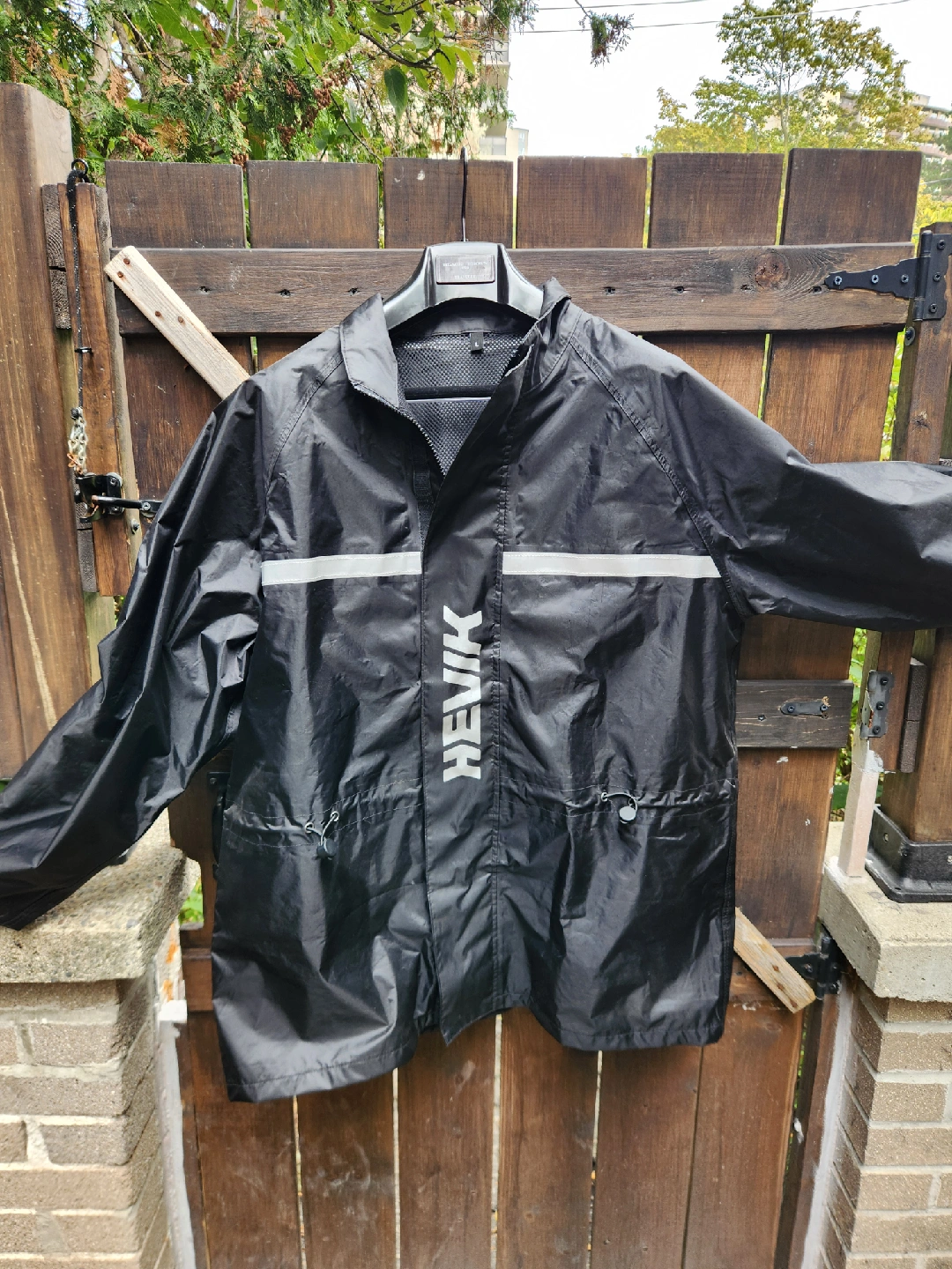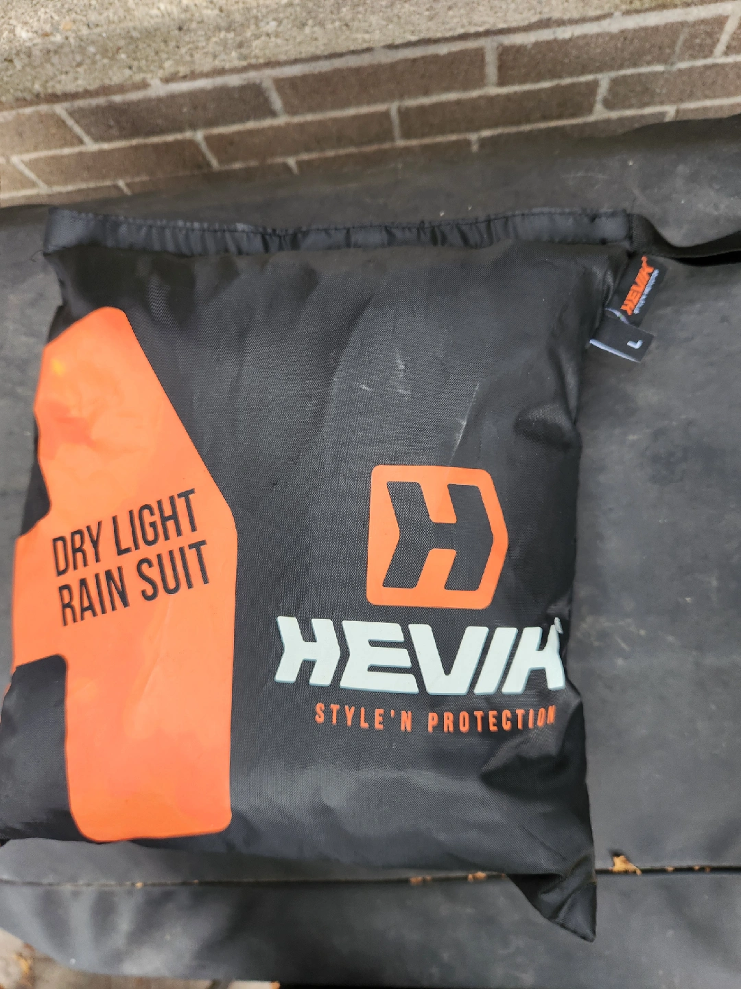 Selling a Hevik Dry Rain riding suit in size L. The suit is black with silver reflectors.. It includes both the jacket and pants with carry pouch. Perfect for rainy days on your motorcycle, scooter etc.
