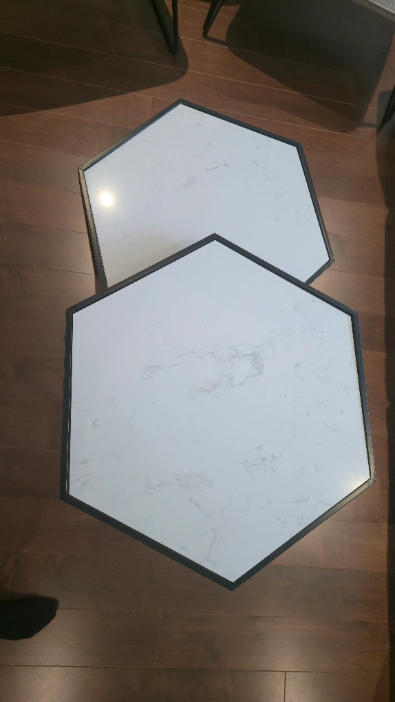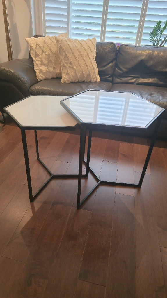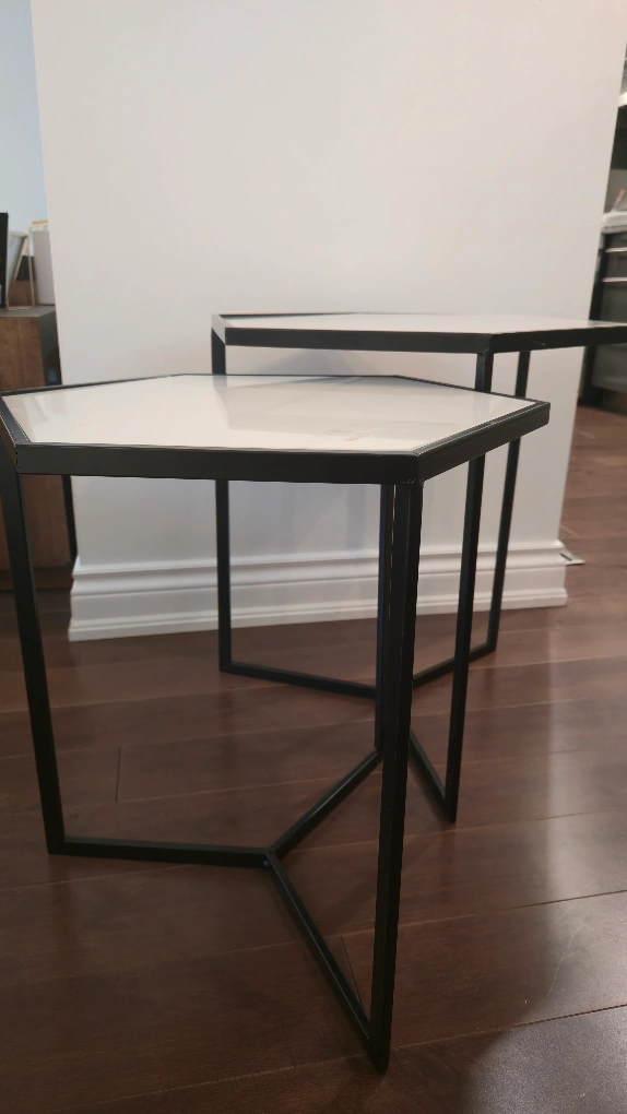 Selling a set of two hexagon nesting side tables. They feature a white marble-look top and black metal frames. Great for adding a modern touch to your living space!