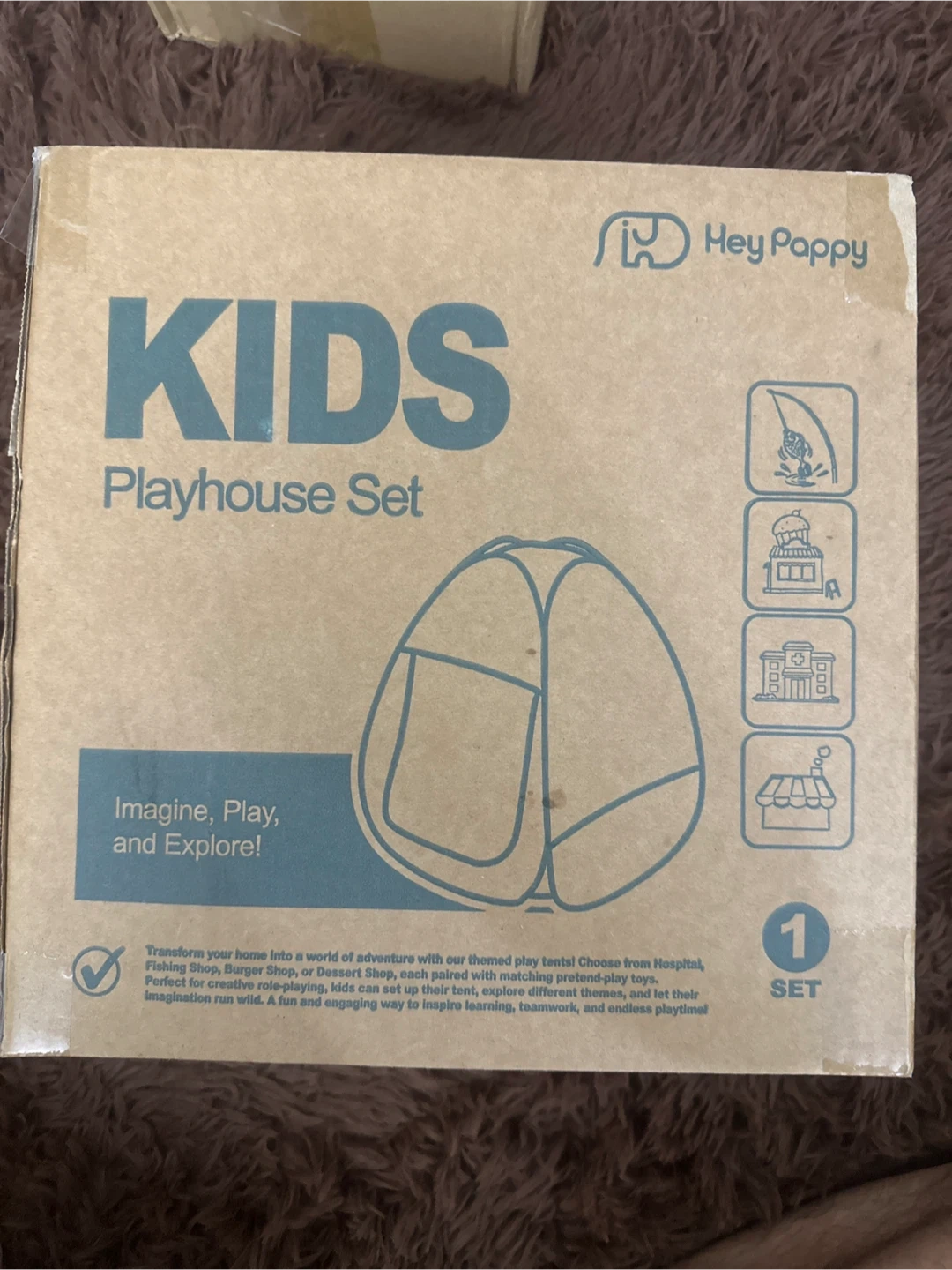 Selling a brand new Hey Pappy Kids Playhouse Set! It's still in the box and ready for imaginative play. Transform your home into a world of adventure with this themed play tent. Perfect for creative role-playing, kids can set up their tent and explore different themes. A fun and engaging way to inspire learning, teamwork, and endless playtime