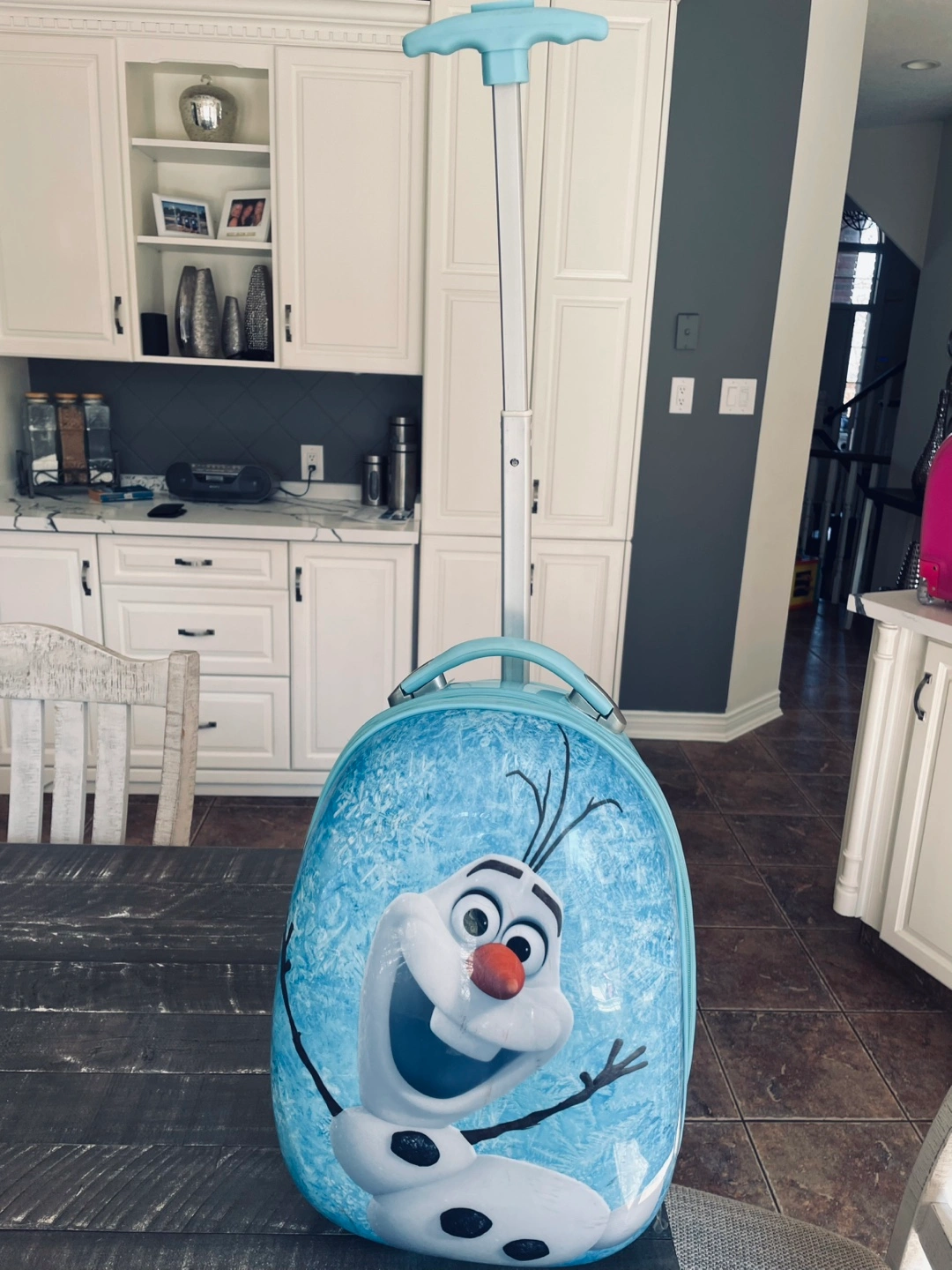 Cute rolling suitcase featuring Olaf from Disney's Frozen. Perfect for little travellers. Features a retractable handle and durable shell. Great condition and clean