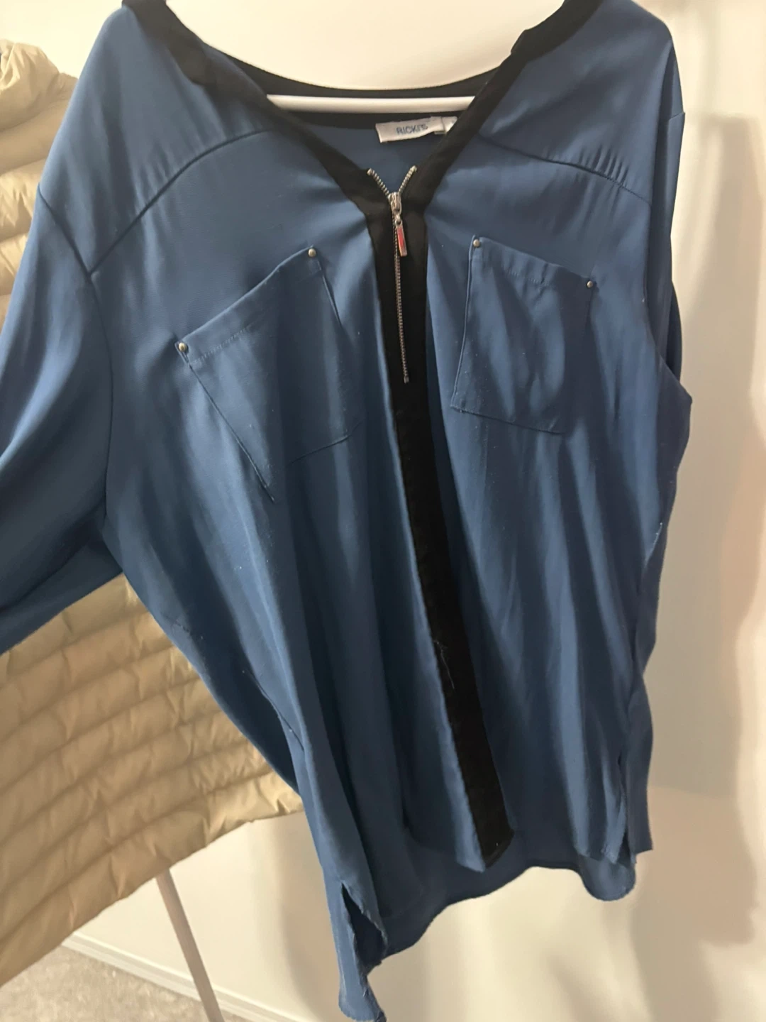 A stylish Rickis blouse in a lovely shade of blue! It features a unique zipper detail down the front and two small pockets. Perfect for adding a touch of flair to your wardrobe