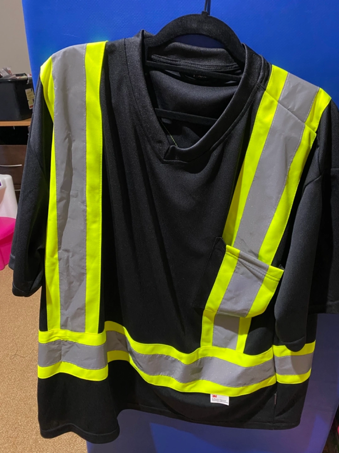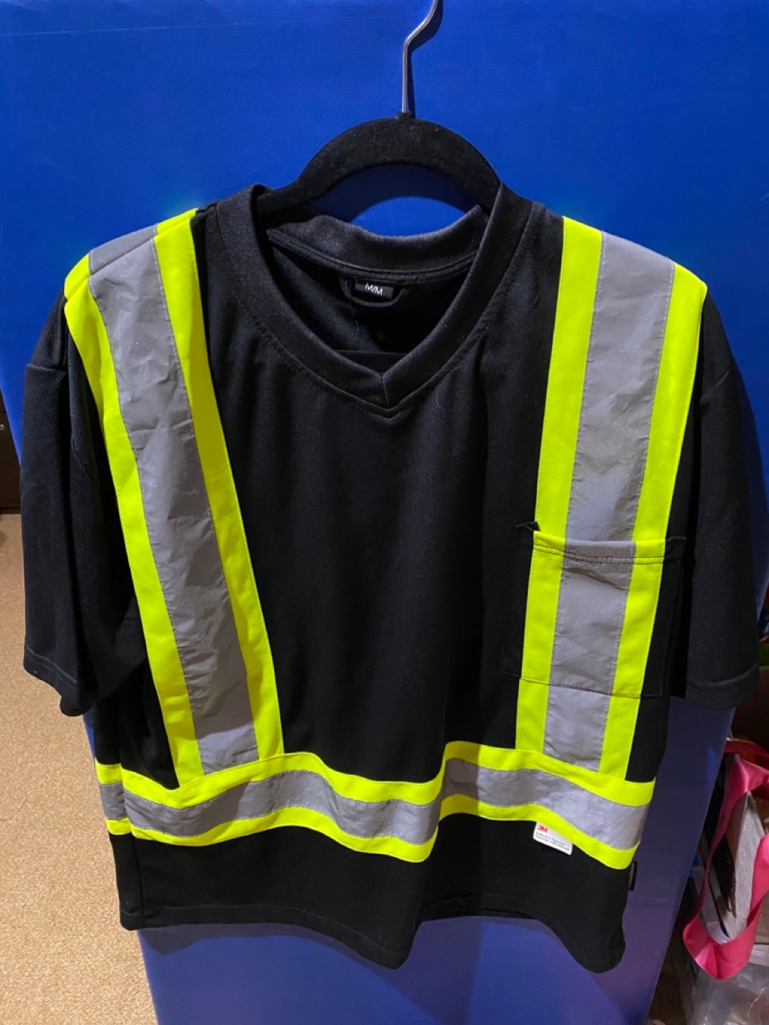 Selling a hi-vis safety t-shirt in black and yellow. It features reflective stripes for increased visibility. Great for work or any activity where you need to be seen!