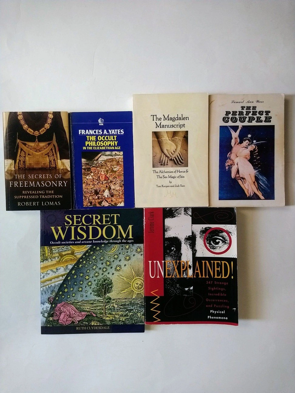 Location: Yonge and College /downtown Toronto $6 each except Secret Wisdom. Cash only; prices are firm. - The Secrets of Freemasonry: Revealing the Suppressed Tradition - Robert Loman - The Occult Philosophy in the Elizabethan Age - Frances A. Yates - The Magdalen Manuscript: The Alchemies of Horus & The Sex Magic of Isis - Tom Kenyon & Judi Sion - The Perfect Couple - Samael Aun Weor - Secret Wisdom: Occult Societies and Arcane Knowledge Through The Ages - Ruth Clydesdale -$8 - Unexplained! 347 Strange Sightings, Incredible Occurrences, and puzzling Physical Phenomena - Jerome Clark Feel free to check out my other book posts as well!