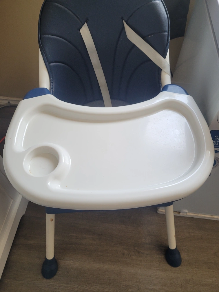 Selling a high chair with a blue and white colour scheme. It has a tray and a safety harness. Perfect for feeding time!