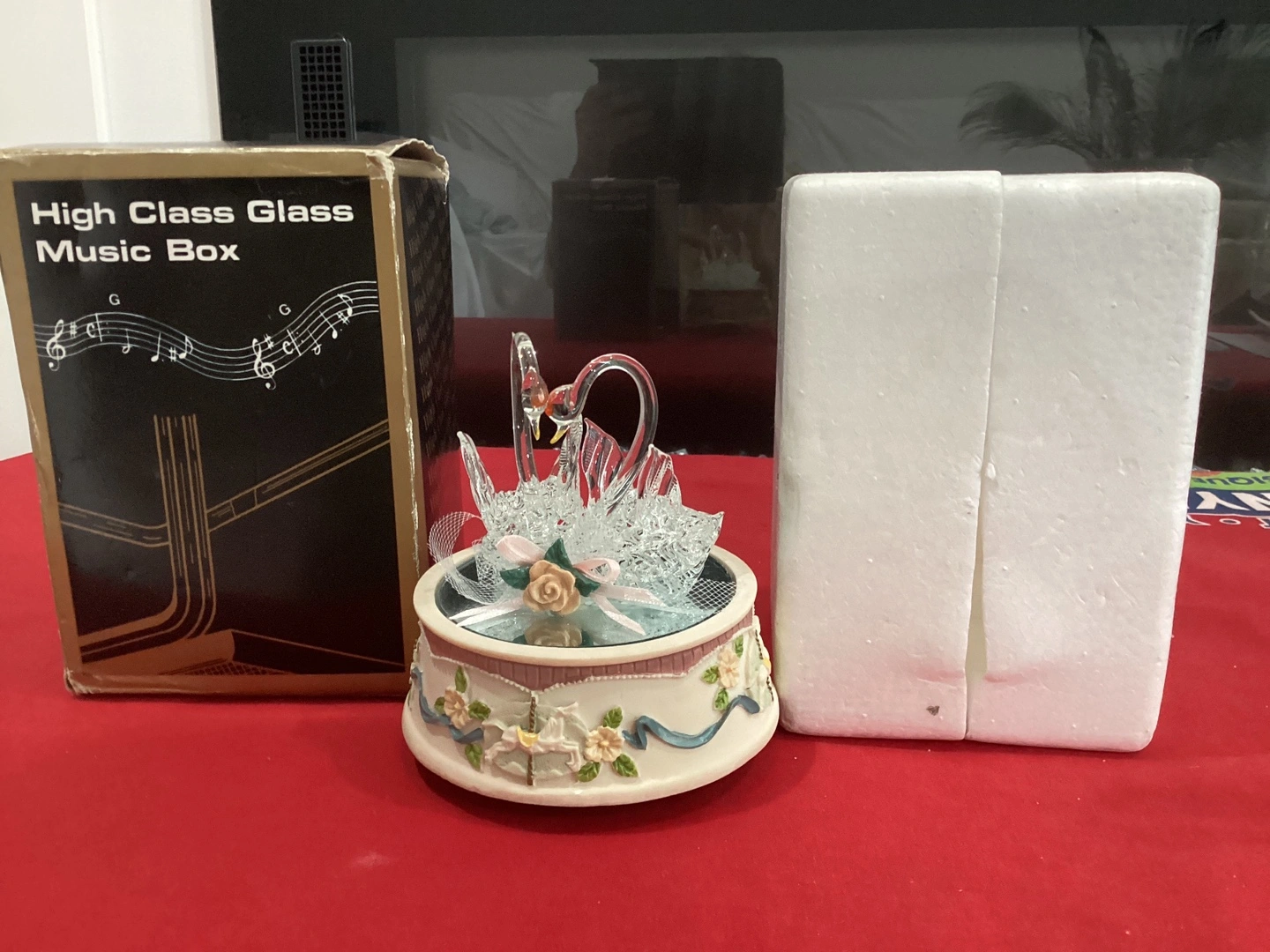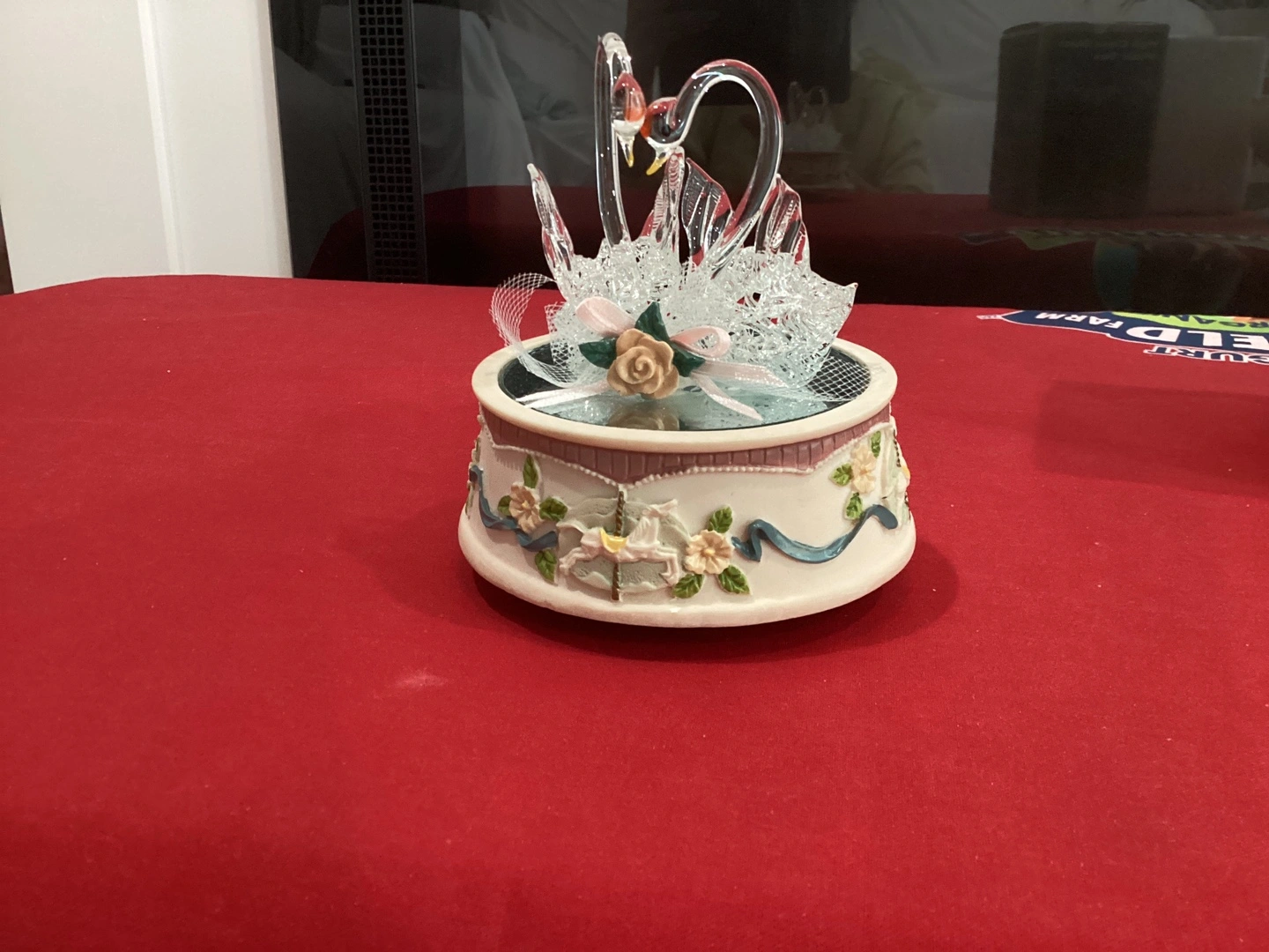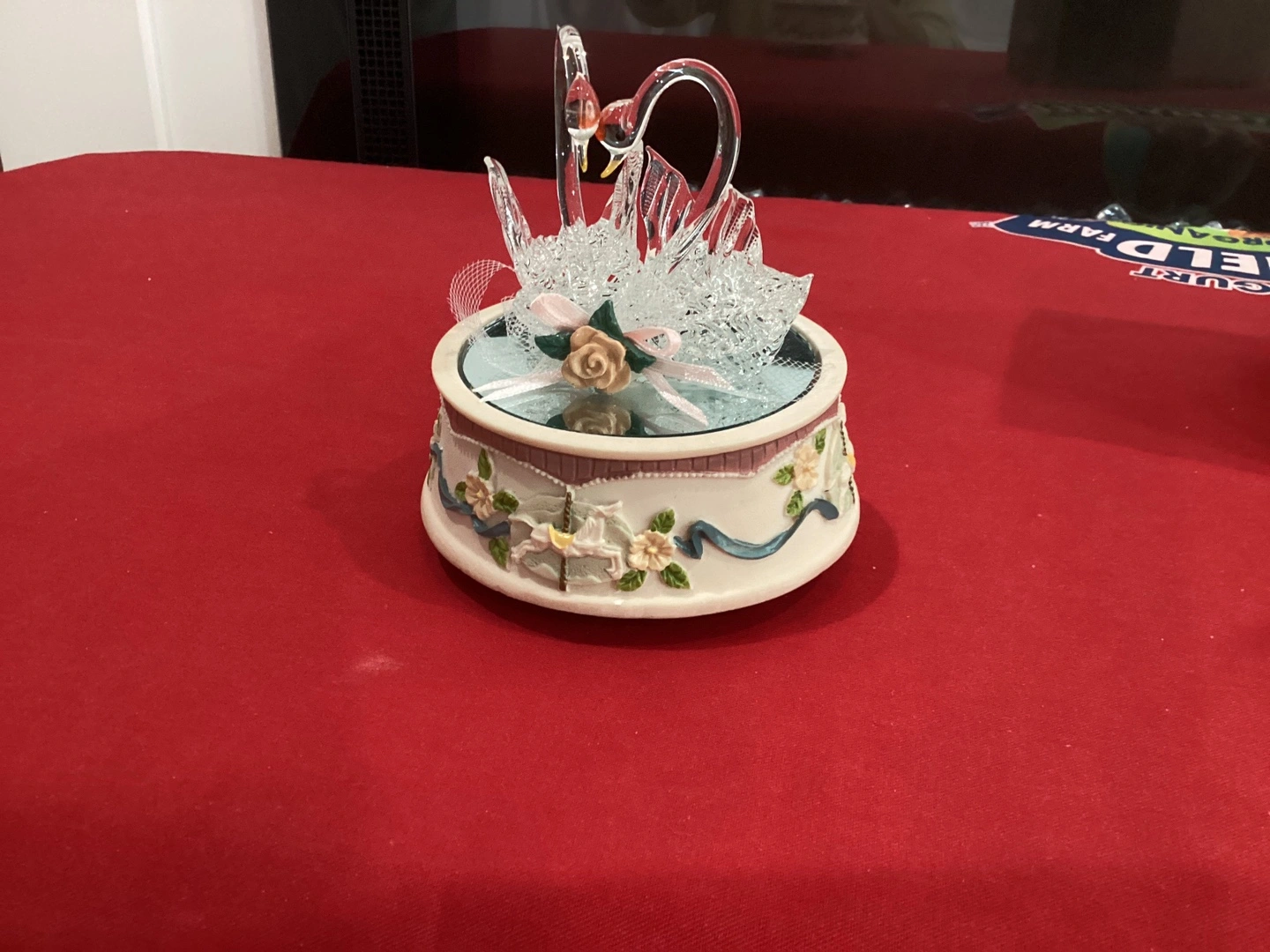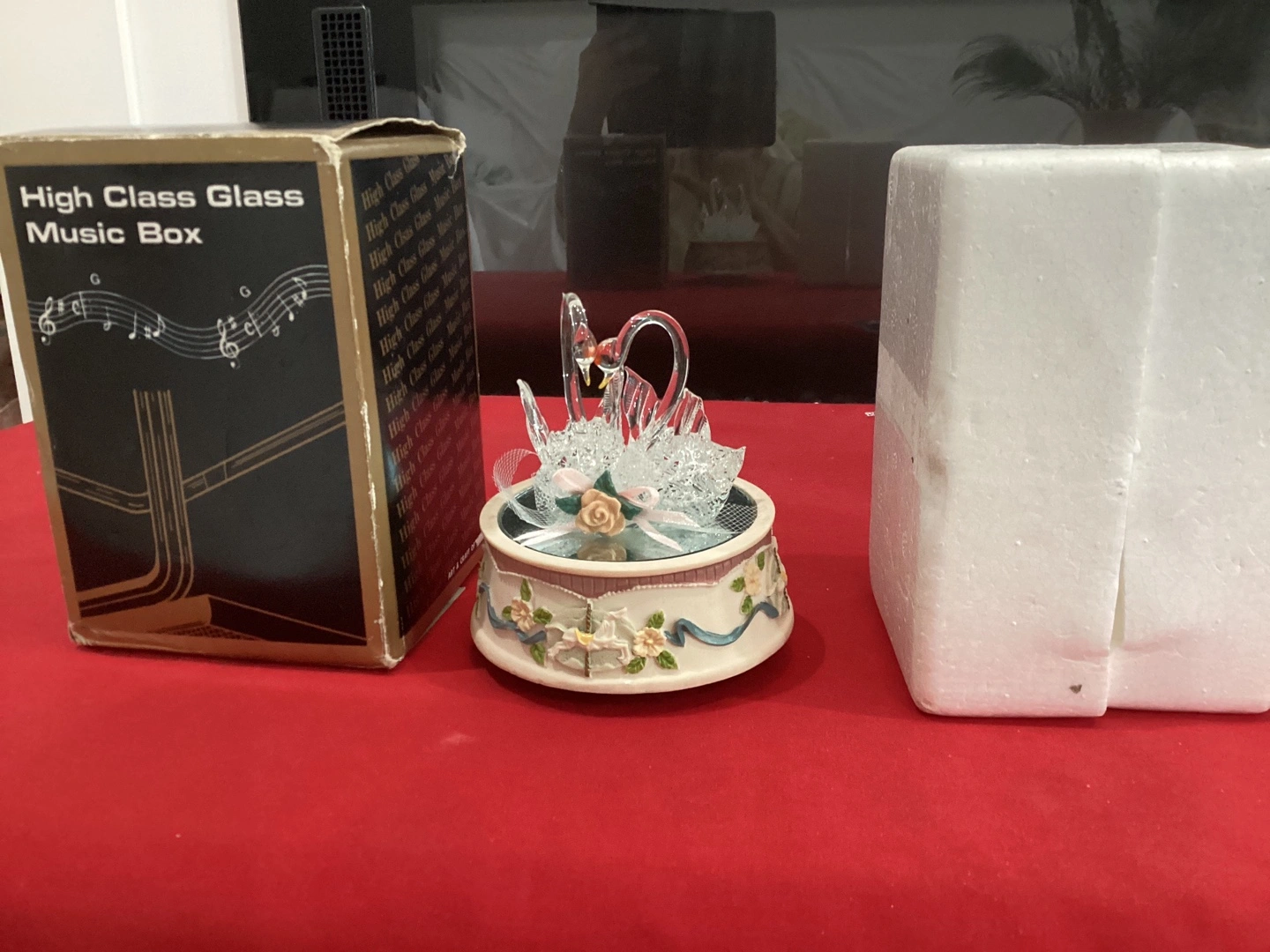 Selling a beautiful glass swan music box! It's in great condition and comes with its original box. The swans are made of clear glass, and the base is decorated with flowers and a ribbon. It would make a lovely addition to any room!