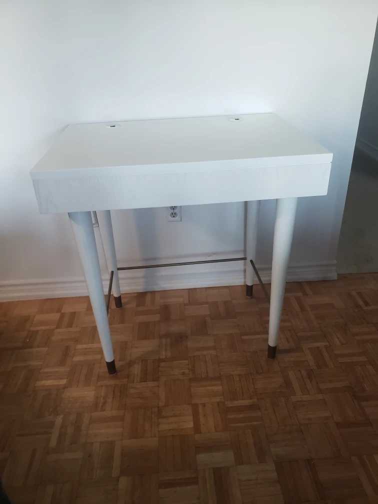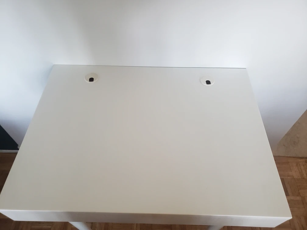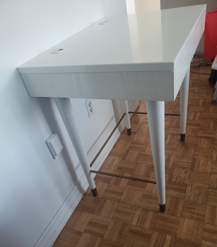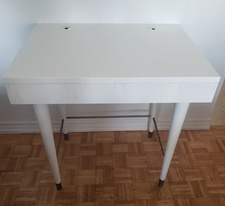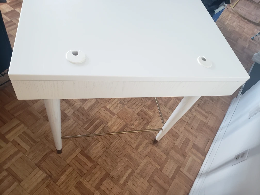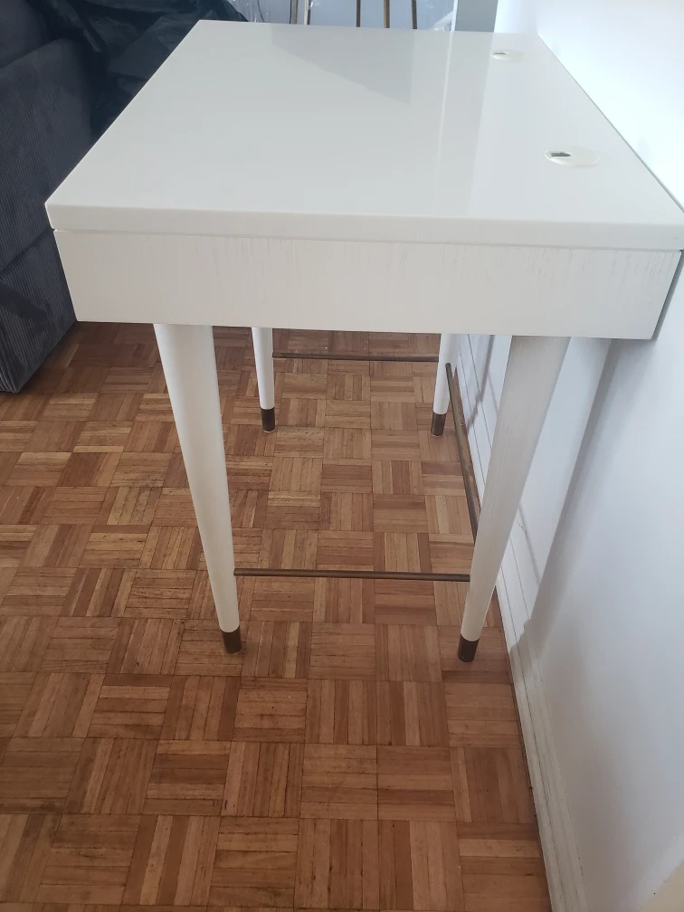 Here's a stylish high desk/table/kitchen island if you want it to be. It has a real white marble top, with solid wood legs. The table is white in color, with legs painted in white and gold. It would be perfect for a small space, home office, extra working space in the kitchen, business table, or salon table. It features a clean design with rounded legs and a smooth surface. The desk also has two holes on top for cable management and under-desk cable management tray, keeping your workspace tidy and organized. The item is very sturdy with metal plates under the table to keep the real marble top fixated to the table. Dimensions: 84.5 cm width, 61 cm length & 86 cm height.