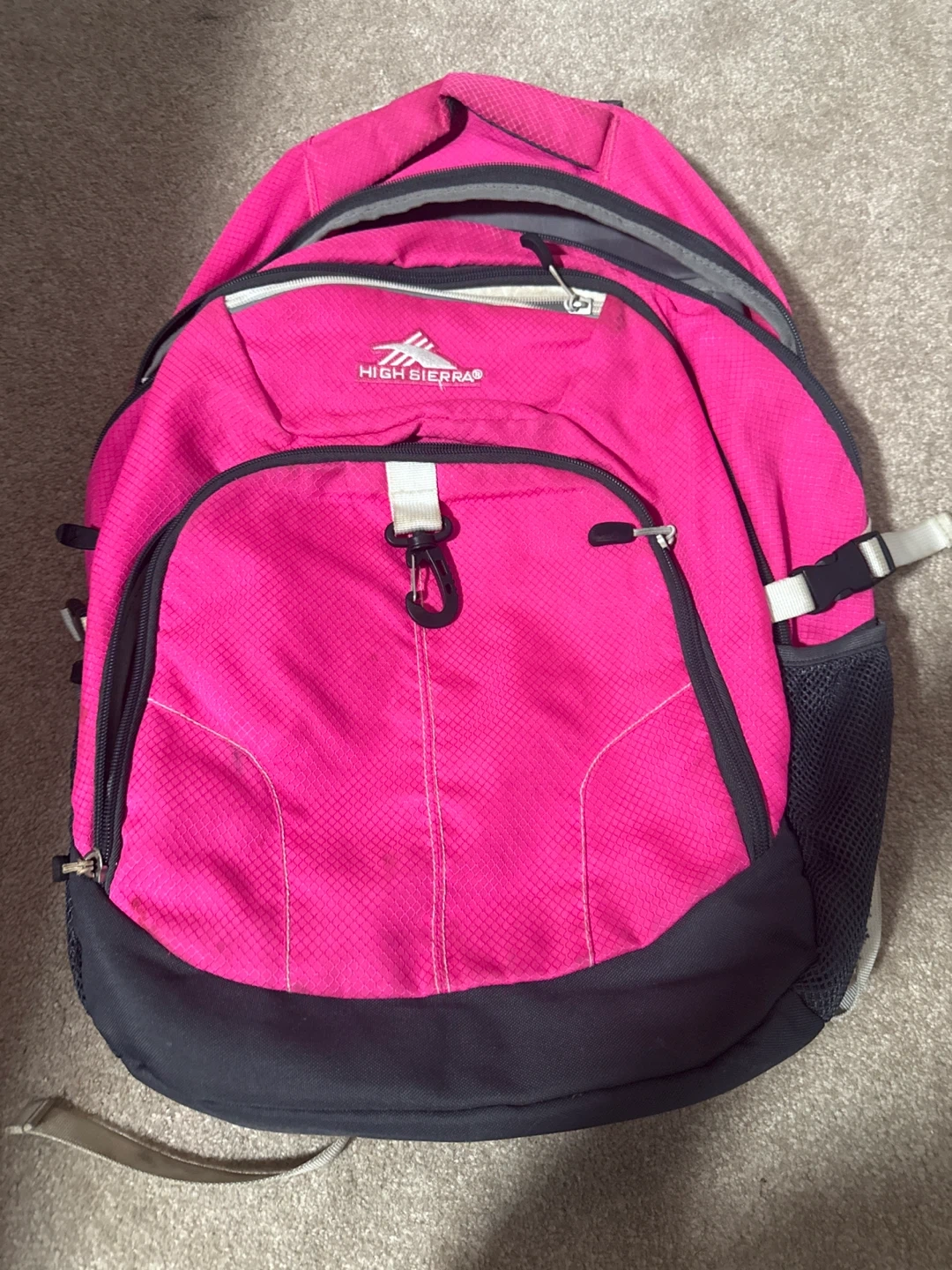 Selling a High Sierra backpack in pink and grey! It has lots of pockets and space inside. Perfect for school or travel, it's in great condition.