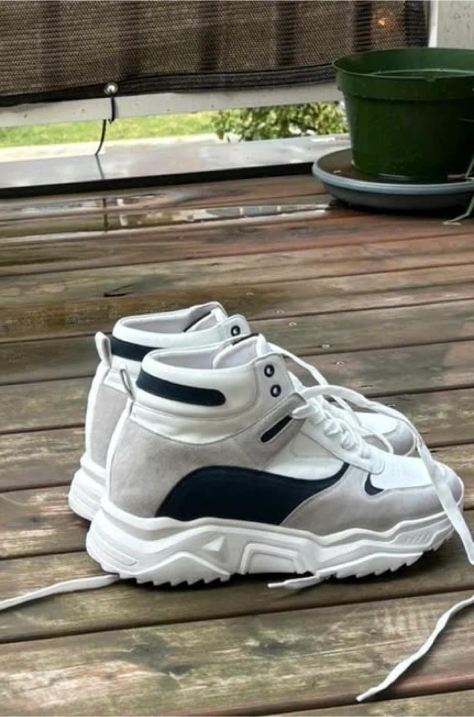 These high-top sneakers feature a stylish combination of white, grey, and navy. They are still in very good condition and would make a great addition to your footwear collection! My brother only wore once and would like to sell them.