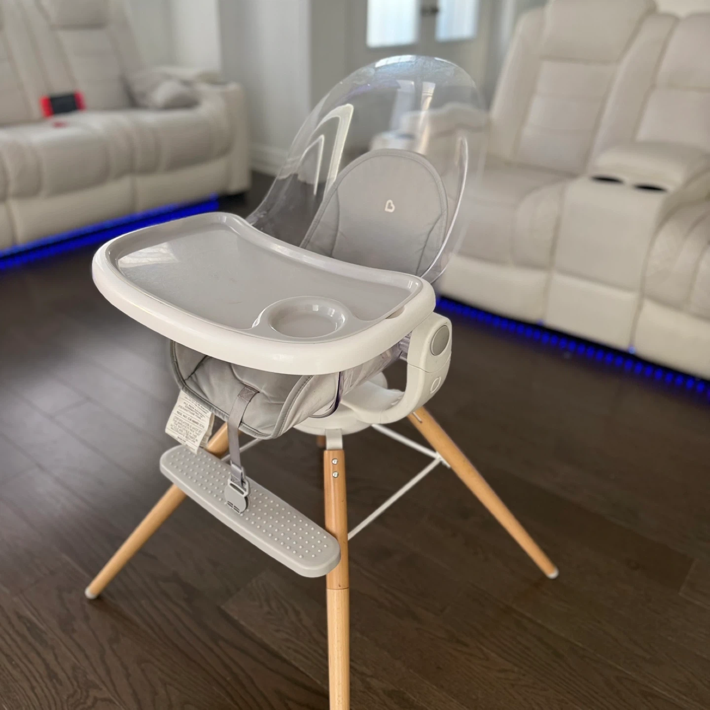 Selling a Boon Flair highchair in excellent condition! This stylish highchair features a contemporary design with a grey seat and wooden legs. It's perfect for mealtime and provides a comfortable and safe seating option for your little one