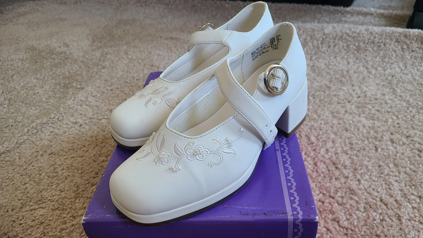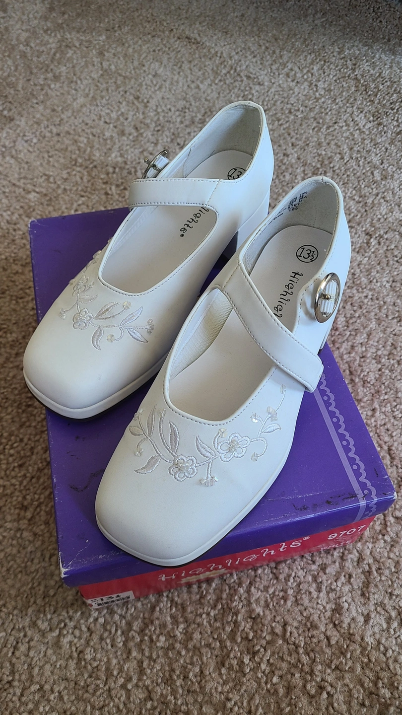 Highlights Girls' Dress Shoes: Low Heel Hook Design Pre-owned, good condition Colour: White Size: 13 1/2