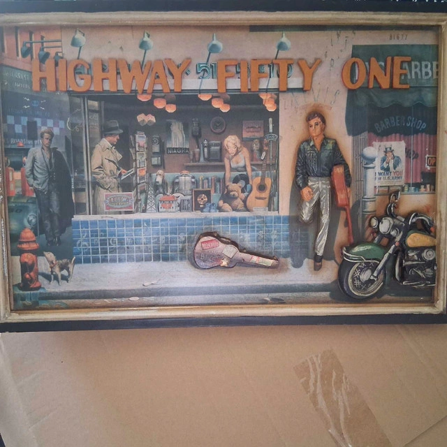 Used Highway Fifty One shadow box art piece, featuring a detailed and nostalgic street scene. The artwork combines painting and 3D elements to create a unique visual experience. It captures a scene with figures reminiscent of classic Americana. The condition is good, displaying minor wear that adds to its vintage charm. Features a combination of painting and 3D elements. Depicts a detailed street scene with various figures and objects. Framed and ready to hang. This unique piece is sure to add character to any room. Available while the ad is up, so don't miss out!