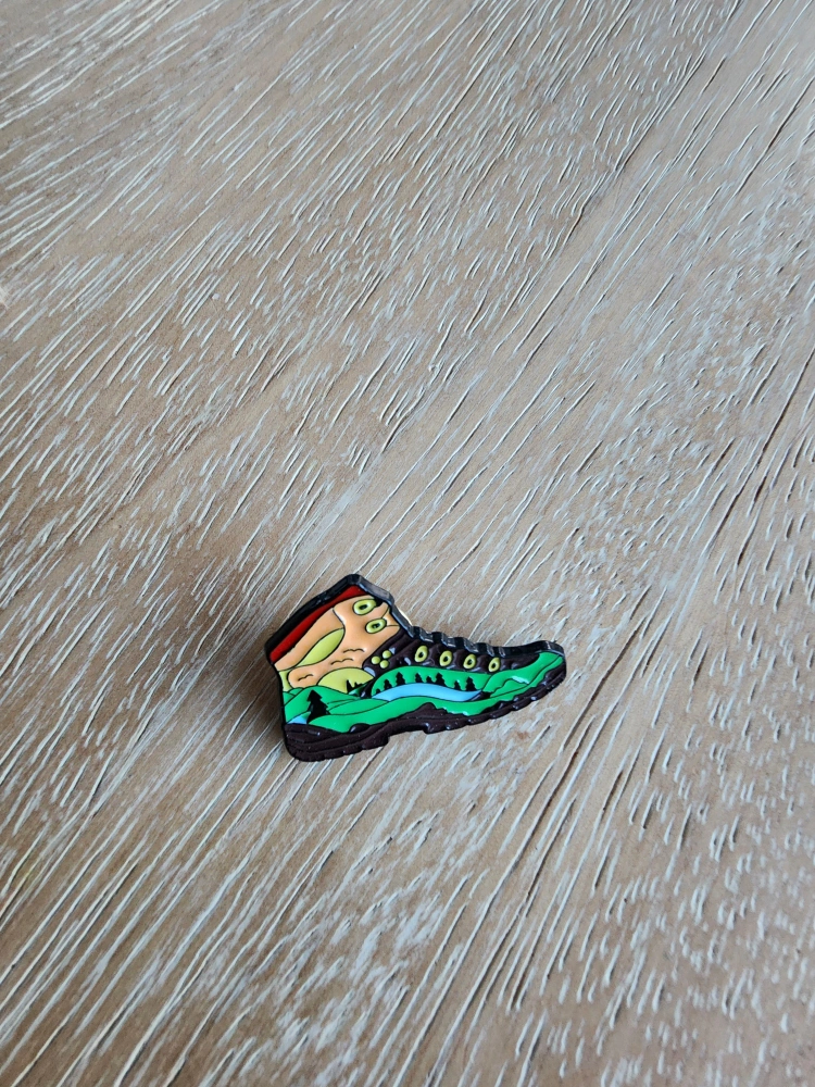 Cute hiking boot enamel pin! It's got a fun design with a little landscape on the side. Perfect for adding a bit of outdoorsy flair to your backpack or jacket