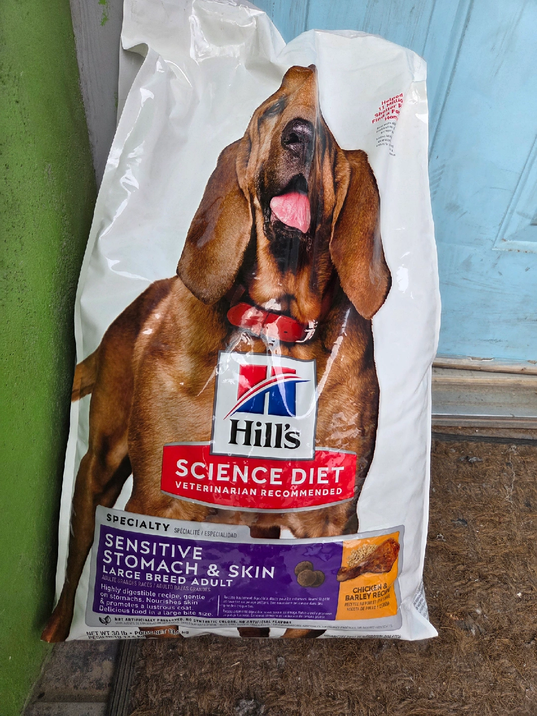 Selling a bag of Hill's Science Diet dog food. It's the Sensitive Stomach & Skin formula for large breed adult dogs. The recipe is highly digestible and gentle on stomachs, plus it nourishes the skin and promotes a lustrous coat. Net weight is 30 lb (13.6 kg)