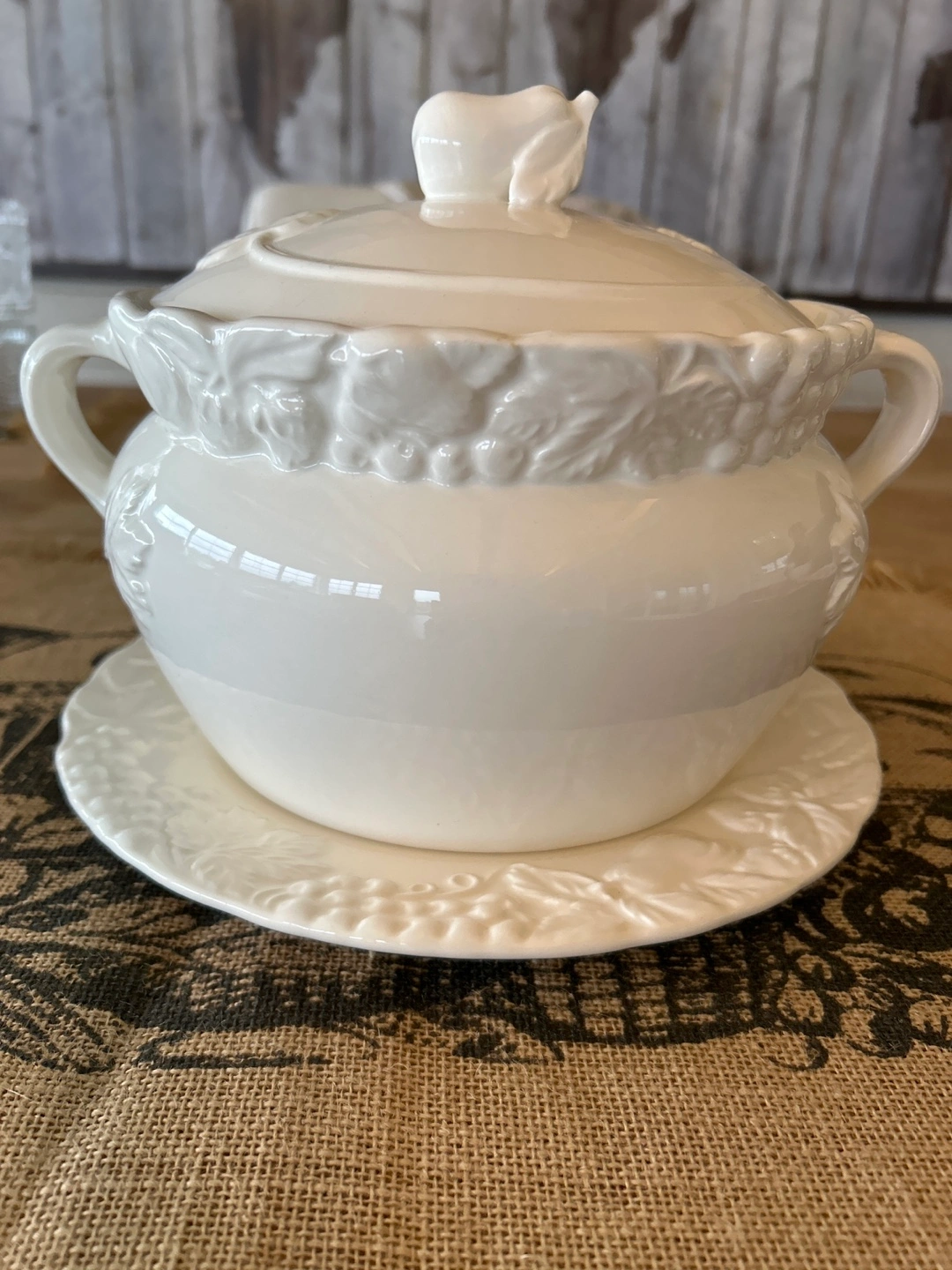 Selling a Himark soup tureen casserole dish with a decorated lid and side handles. It also comes with a plate. The dish is white and features a fruit design. Made in Japan. No ladle.