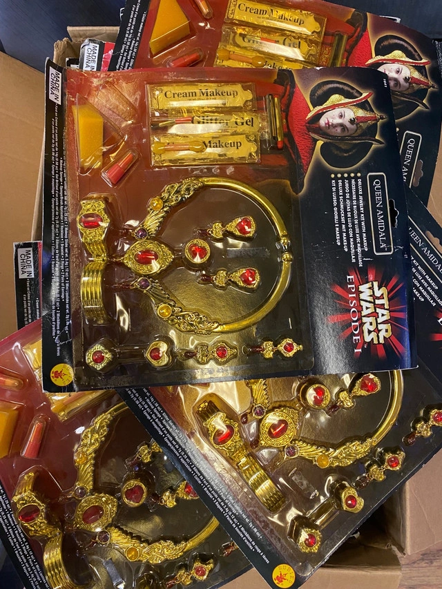 Hippopotamus hand held shower with hose 200 units $5 each if take all Digimon Halloween costume 200 units $3 each if take all nail polish lipstick combo 10 boxes stardust fairy accessory 5 boxes Star Wars queen Amidala Halloween accessory kit, Star Wars, episode one full box Condition: New For Sale By: Owner