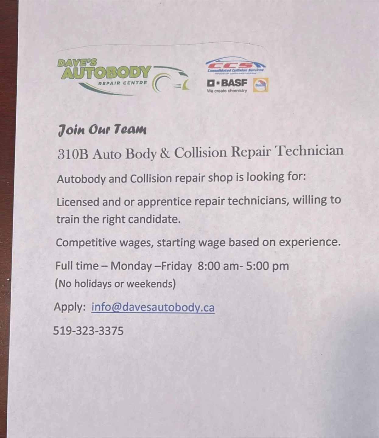 Dave’s auto body is looking to hire a Autobody collision repair technician. Please see above pic and respond to info if you think this is the right fit for you. Located just below Mount Forest