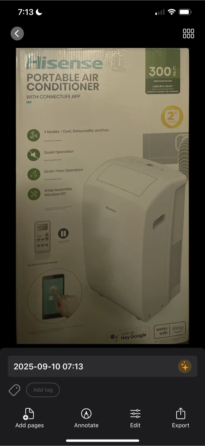 Selling a Hisense portable air conditioner. It's in great shape and ready to keep you cool this summer! Features include: - 3 Modes: Cool, Dehumidify, and Fan - Quiet Operation - Drain-free Operation - Snap Assembly Window Kit - Remote Control Included