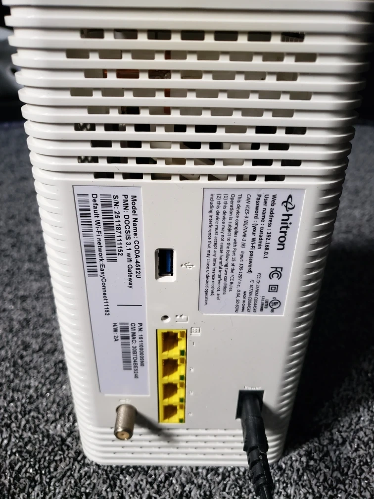 Selling a Hitron CODA-4682U DOCSIS 3.1 WiFi Gateway modem. This gateway is perfect for reliable internet connectivity. It features a USB port and multiple Ethernet ports for versatile connections. It also supports Default WiFi network EasyConnect1152.