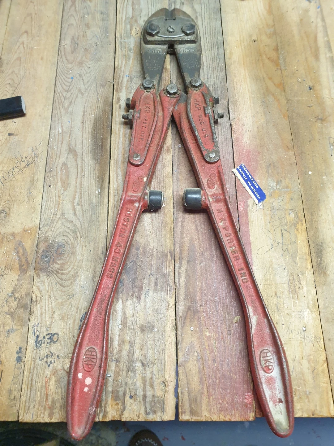 These are a pair of used HK Porter bolt cutters, featuring robust construction and a bright red finish, designed for cutting through bolts, rods, and other metal materials with ease. These heavy-duty tools have seen some action but are still in good working condition, ready to tackle tough cutting jobs. The 43 MASS edition means they were made in Boston, Massachusetts. Specifications: * Brand: HK Porter * Type: Bolt Cutters * Made in Boston, Massachusetts Ever wonder if tools have stories to tell? These bolt cutters probably do, and if they could talk, they'd likely spin a yarn about hard work and getting the job done. But since they can't, I'll just let you know that if you're seeing this ad, they're still available for purchase! No Holds First PU. Union/Weber Waterloo
