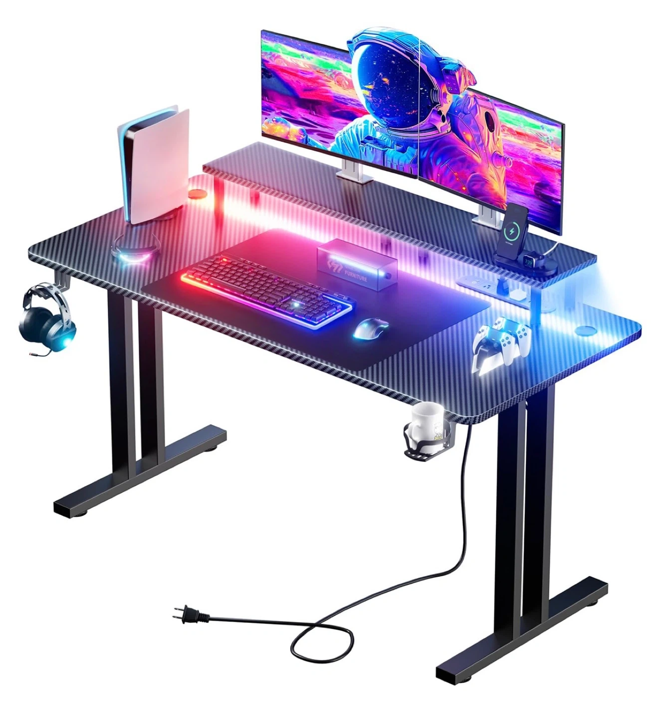 🌸 Yes,It’s brand new in box Can open for you to check price firm… the Power Outlet on the left or right? Not sure 【Gaming Desk with Monitor Stand & LED Lights】This gaming desk is featured with a monitor stand, which increases desktop space for all kinds of desktop items and gaming peripherals, protects your neck and back health for those who need to use the computer for long periods of time; Below the monitor stand is equipped with a strip of LED lights that can be controlled remotely via an APP(<10 meters), with more than 6000 colors and 200 lighting modes, creating the ultimate sense of ambience for you; The lights are made of efficient and energy-saving LED strips to save the power. 【Computer Desk with Power Outlets】Featuring with 3 AC outlets and 2 USB ports, this computer desk allows you to charge devices such as phones and laptops without worrying about interruptions during work and play; Located at the desk's top right corner, you can connect the device into the power supply while sitting in your chair; 6.6-Feet power cord gives you flexibility in positioning your gaming desk; 2 cable management holes on both sides of the desktop to neatly conceal cables, keeping the desktop tidy and orderly. 【Large desktop】Large gaming desk sized 63" W x 24" D x 29" H, which is made of 0.6 Inch thickeness high quality carbon fibre, wear-resistant, easy to clean, high load-bearing, long hours of use will not heat up; This computer gamer desk is paired with a large anti-slip mouse pad, headphone hooks and cup holder which is convenient to hold your headphones, bag or drinks. 【Sturdy & Steady Gaming Table】The gaming table is made of 0.8 inch steel frame and triangular bracket construction with ultra-stable double-T legs, the tabletop is supported by a sturdy steel frame, anti-pressure and anti-deformation, load-bearing up to 200 pounds, no fear of placing all kinds of large-scale gaming equipment! The adjustable rounded foot pads ensure the table keeps a sturdy construction on uneven ground, fully satisfying the needs of players.