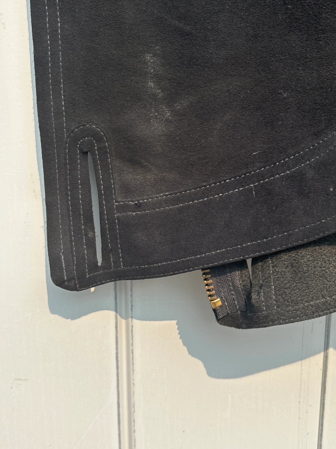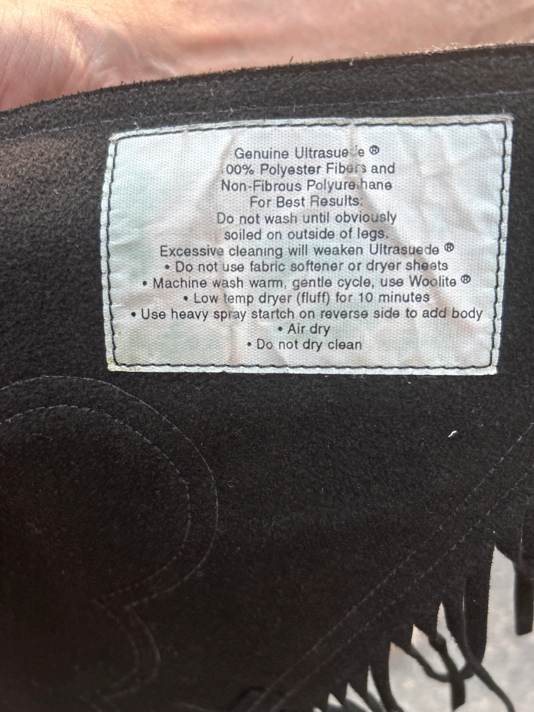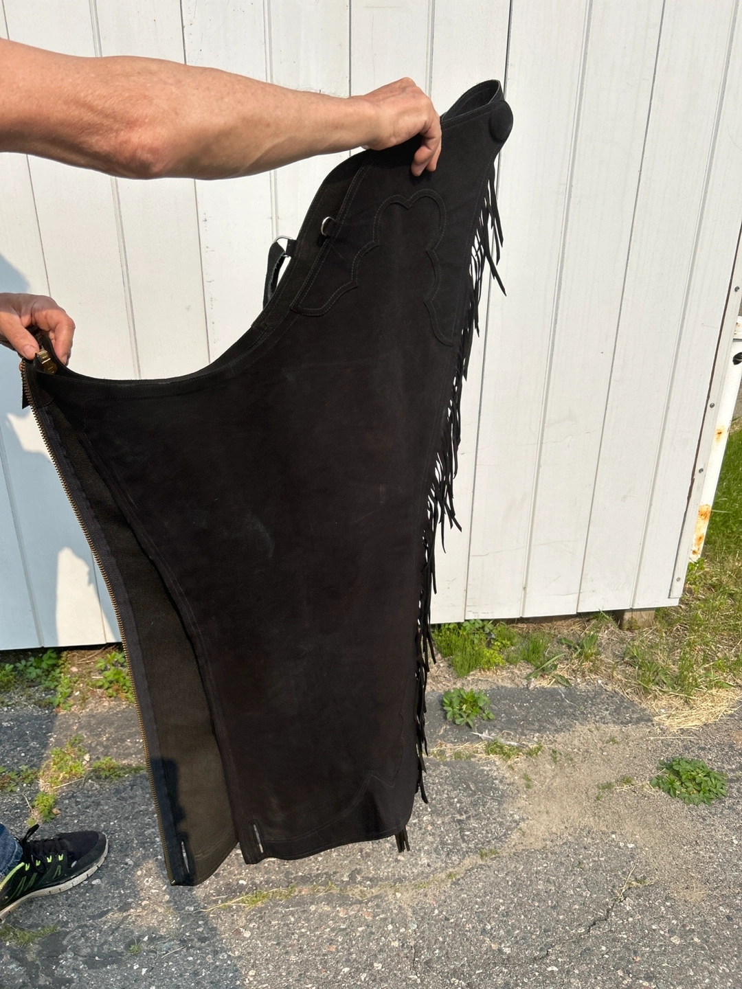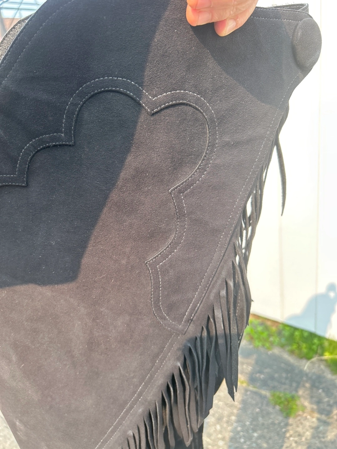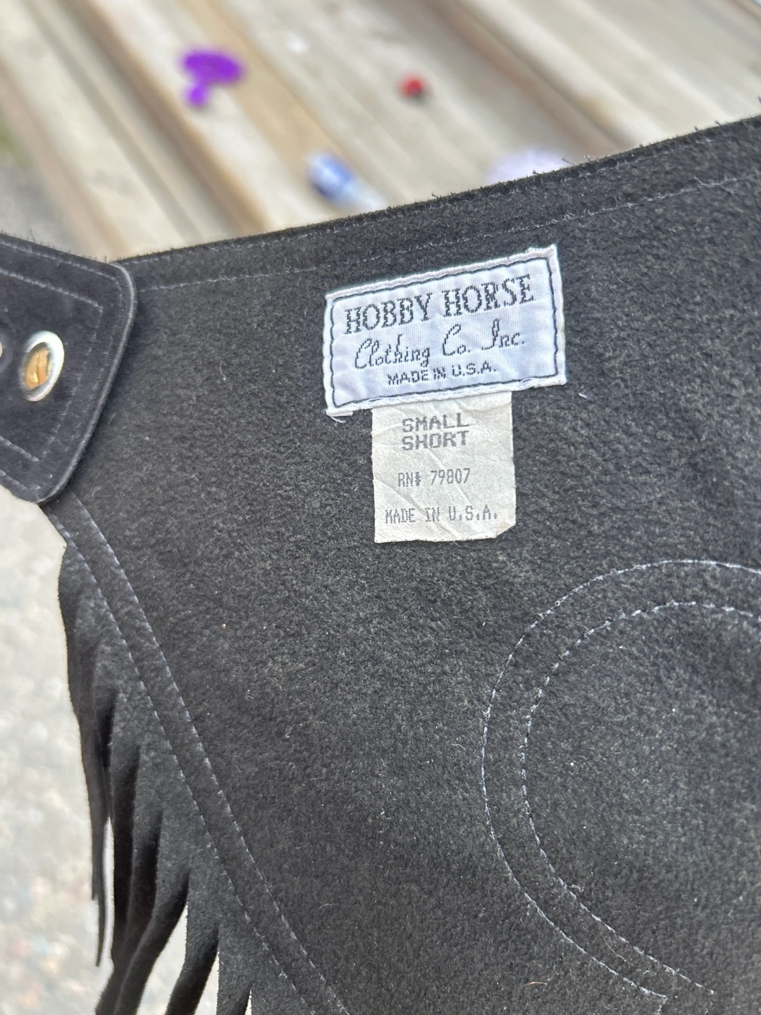 Hobbie Horse Show Chaps black suede chaps. Features fringe detail and zippers a stirrup holes. They are made in the USA and will complete your show outfit size small