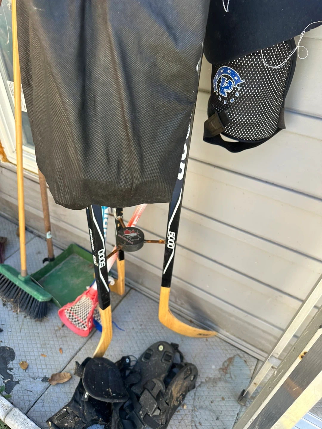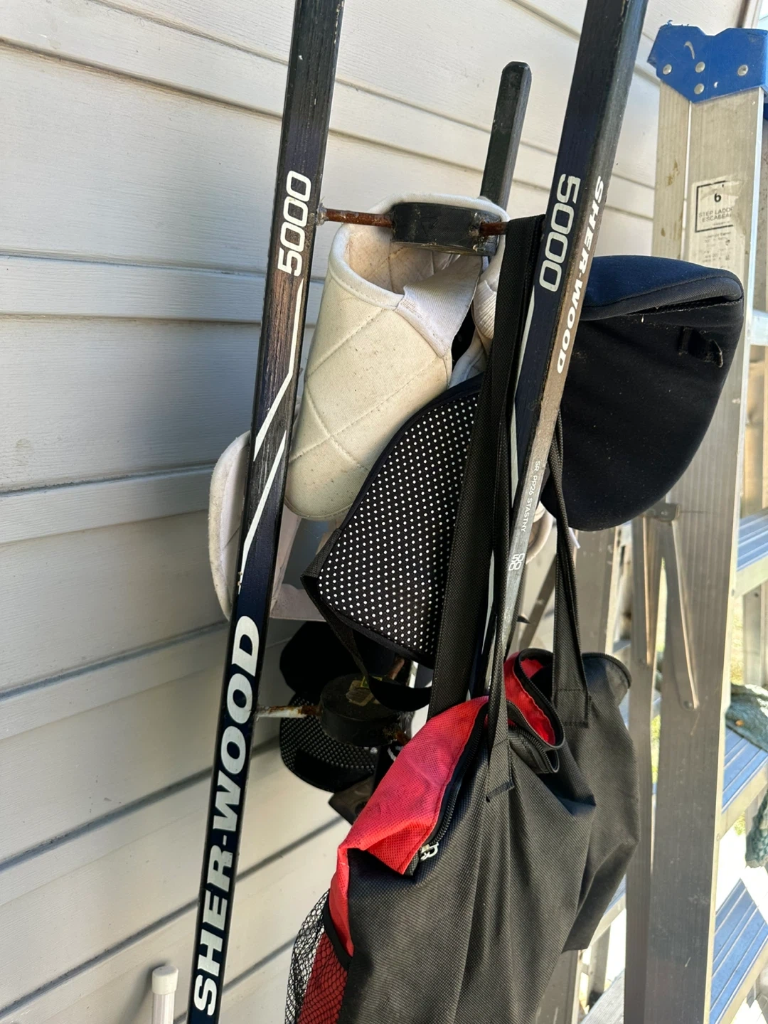 Selling a collection of used hockey gear. Includes hockey sticks (Sher-Wood 5000), a black and red hockey bag, shoulder pads, and other protective gear. Great for someone starting out or needing replacements!