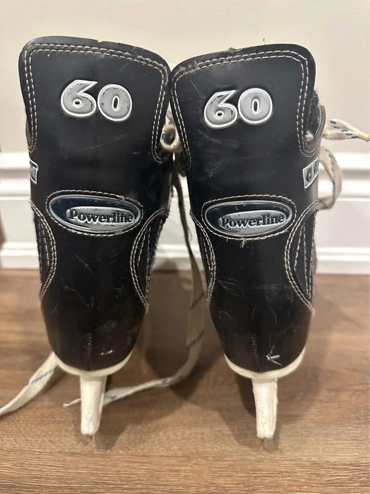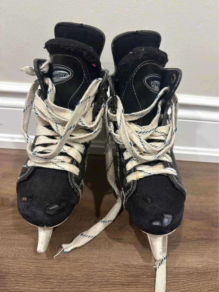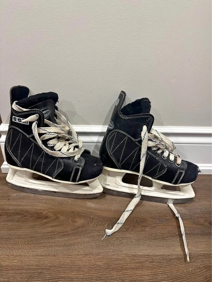 Used hockey skates … NO major damage just wear and tear … blades are good just need to be sharpened … a little rush which can be removed