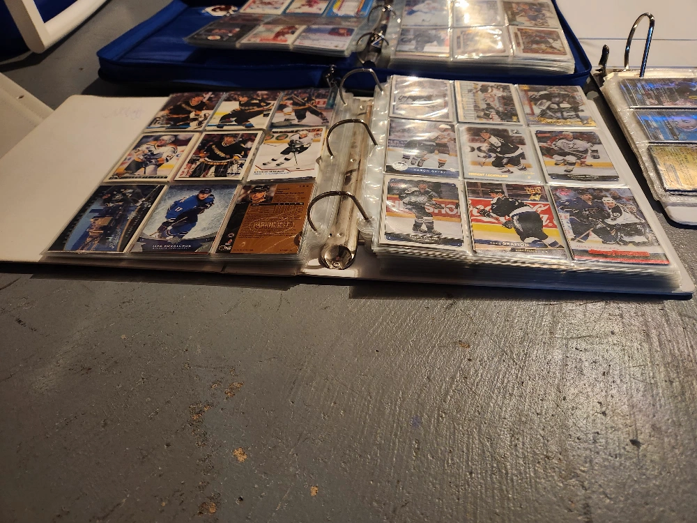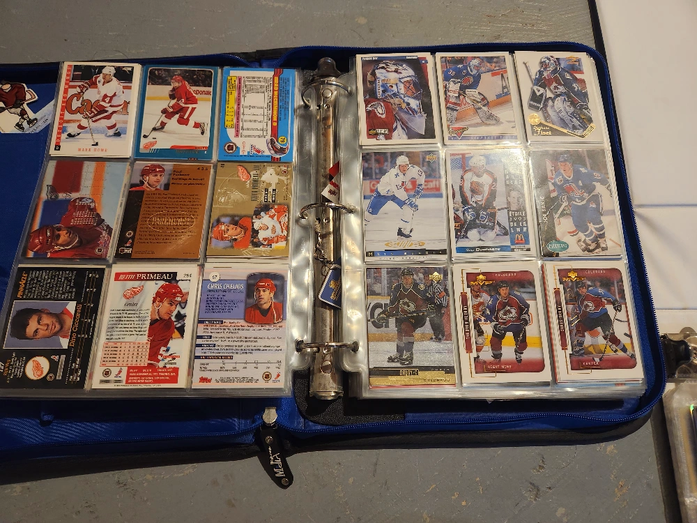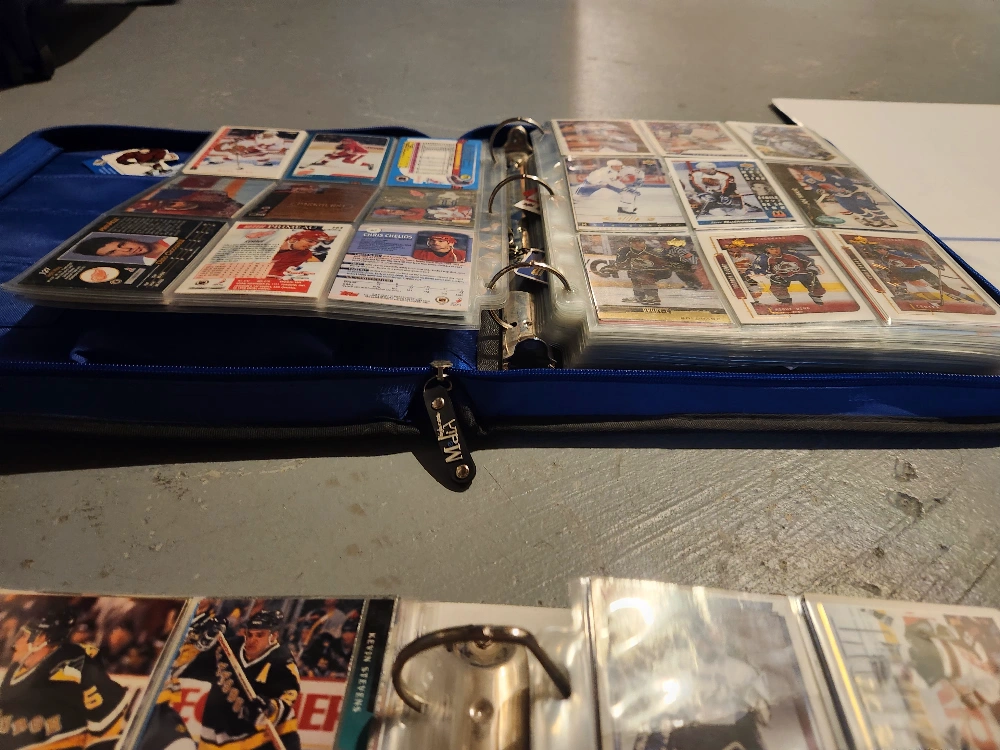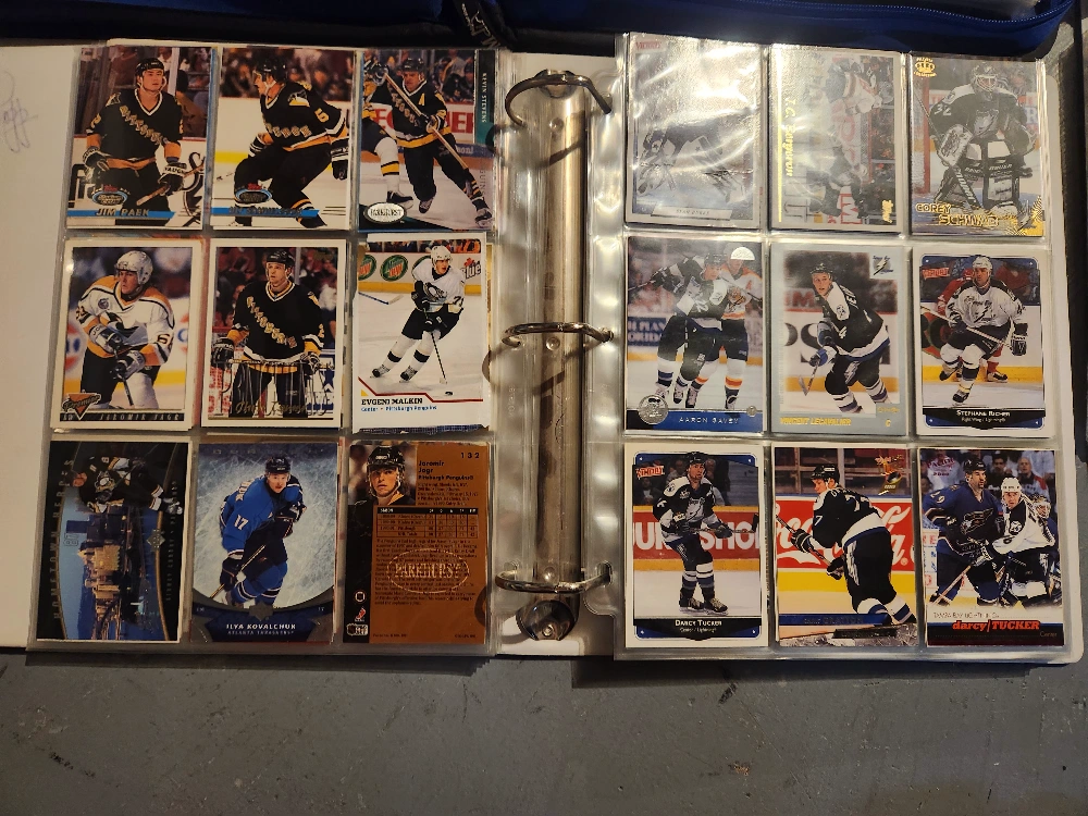 Selling a binder full of hockey trading cards. Great for collectors or anyone looking to start a new hobby! The binder is in good condition and contains a variety of cards from different teams and players