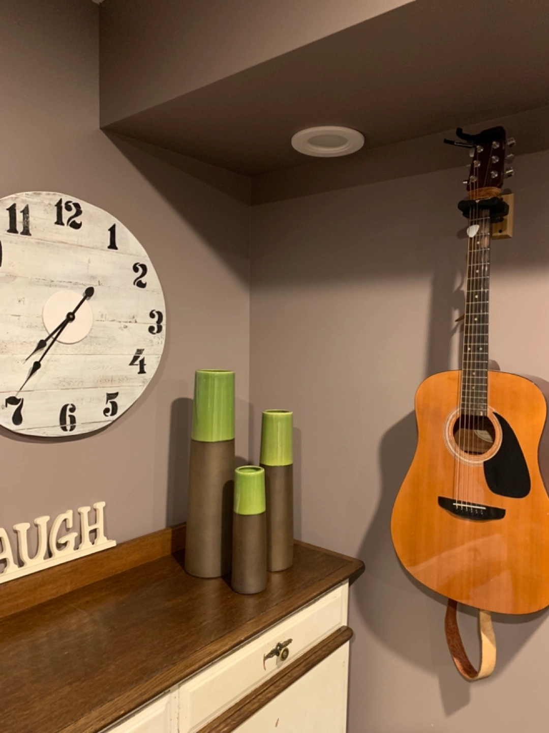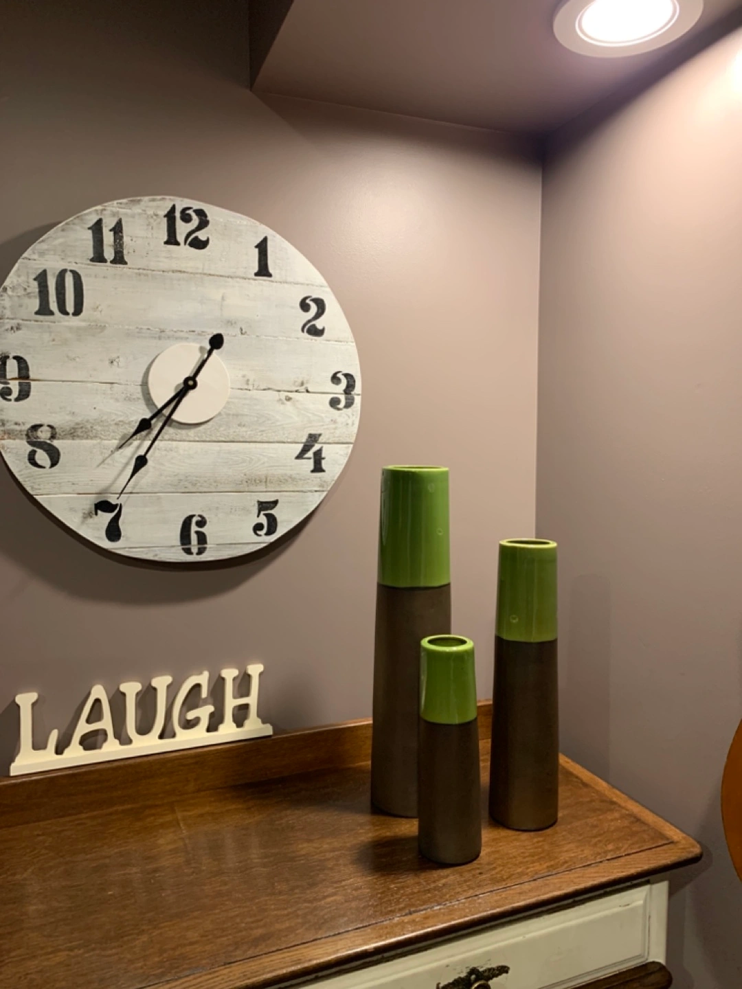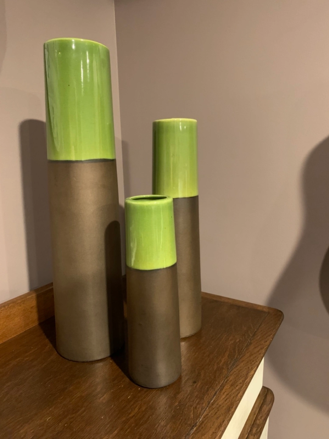 Set of three Hofland Mirabelle cylinder vases! They feature a stylish green and brown. Perfect for adding a touch of modern elegance to any room or for staging. Also included with the 3 vases is a matching pot that fits a 6” plant.