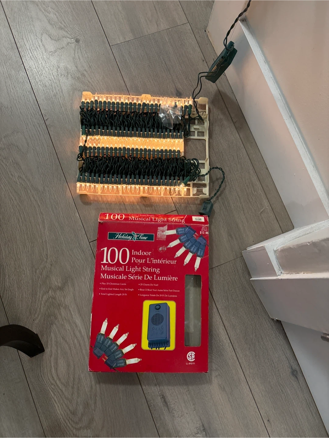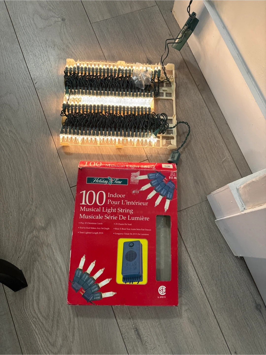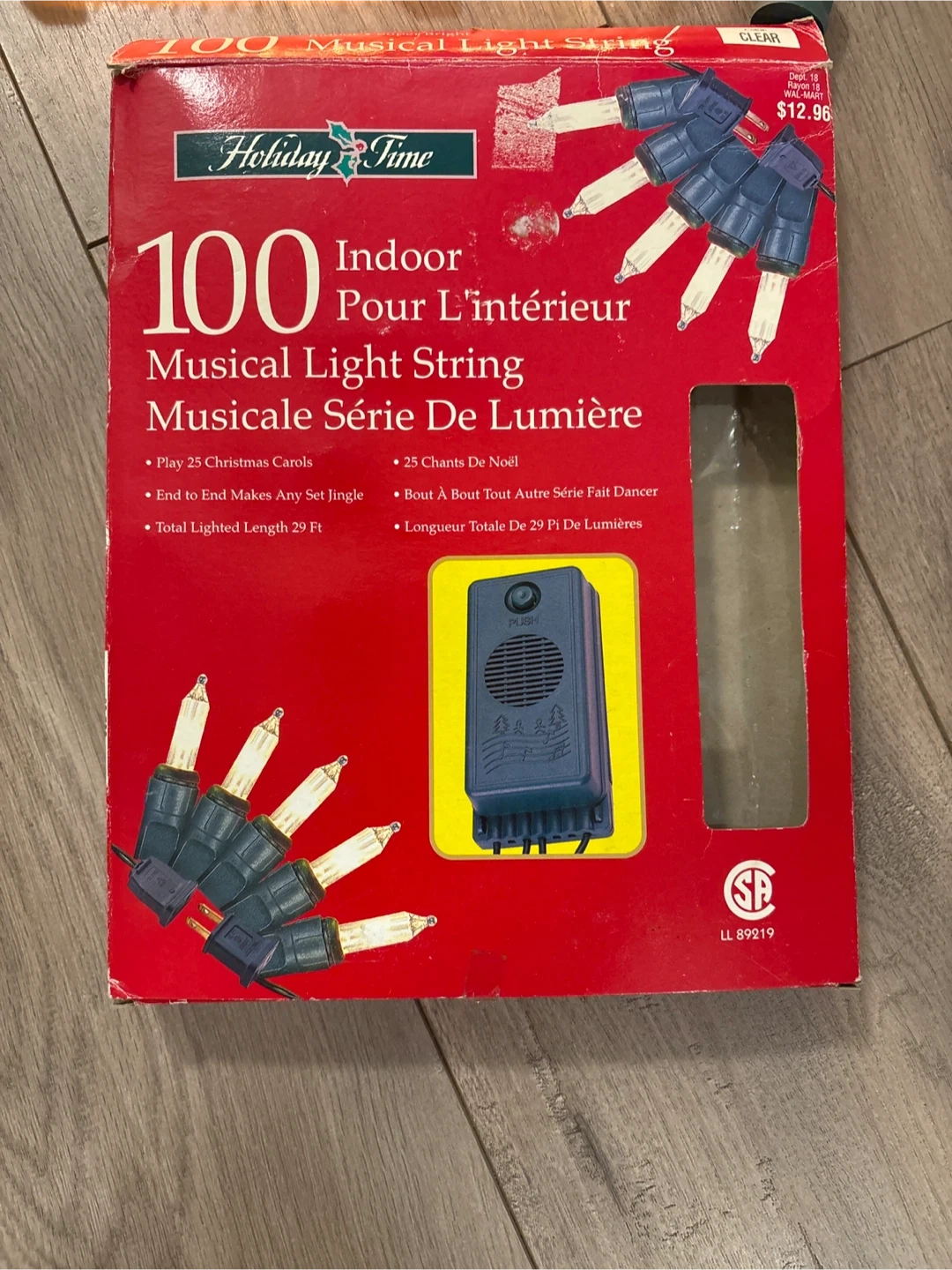 Selling a Holiday Time 100 Indoor Musical Light String. It plays 25 Christmas carols and the total lighted length is 29 ft. The box shows some wear, but the lights themselves are new .