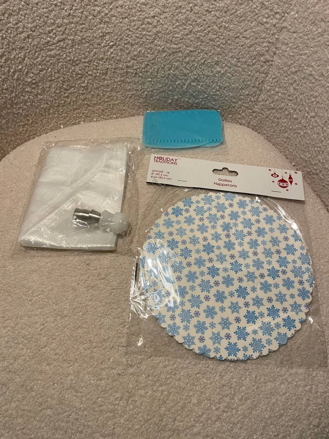 Holiday Traditions doilies and decorating set, perfect for adding a festive touch to your baking or crafting projects! The set includes 18 doilies, each 8 inches (20.3 cm) in diameter, along with a decorating bag and a blue scraper. Great for holiday baking!