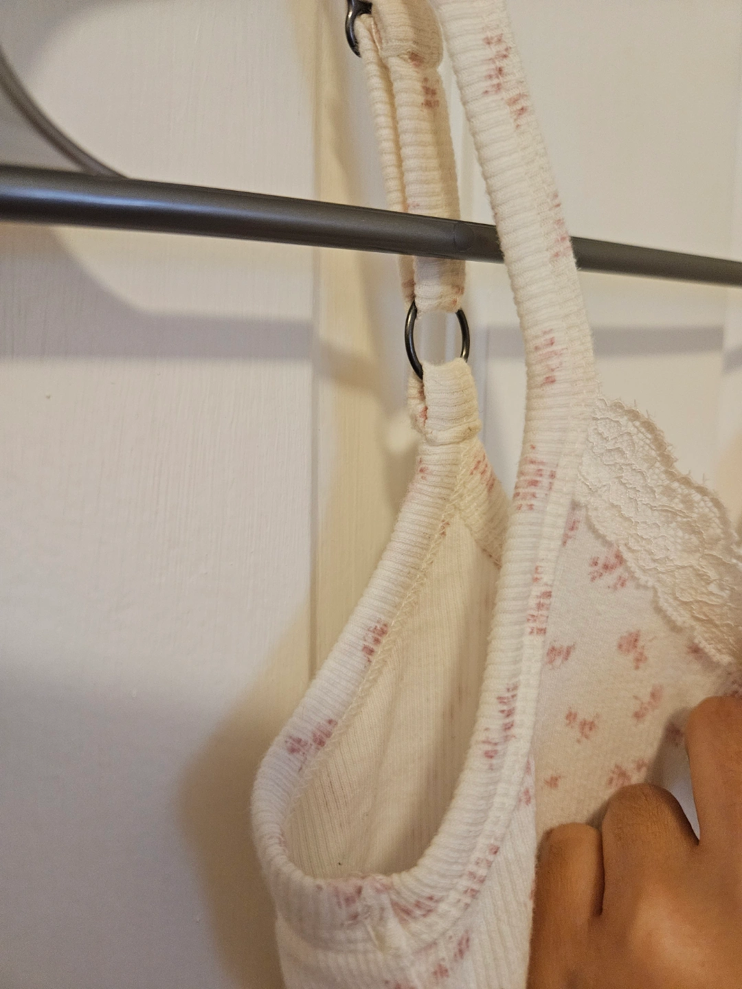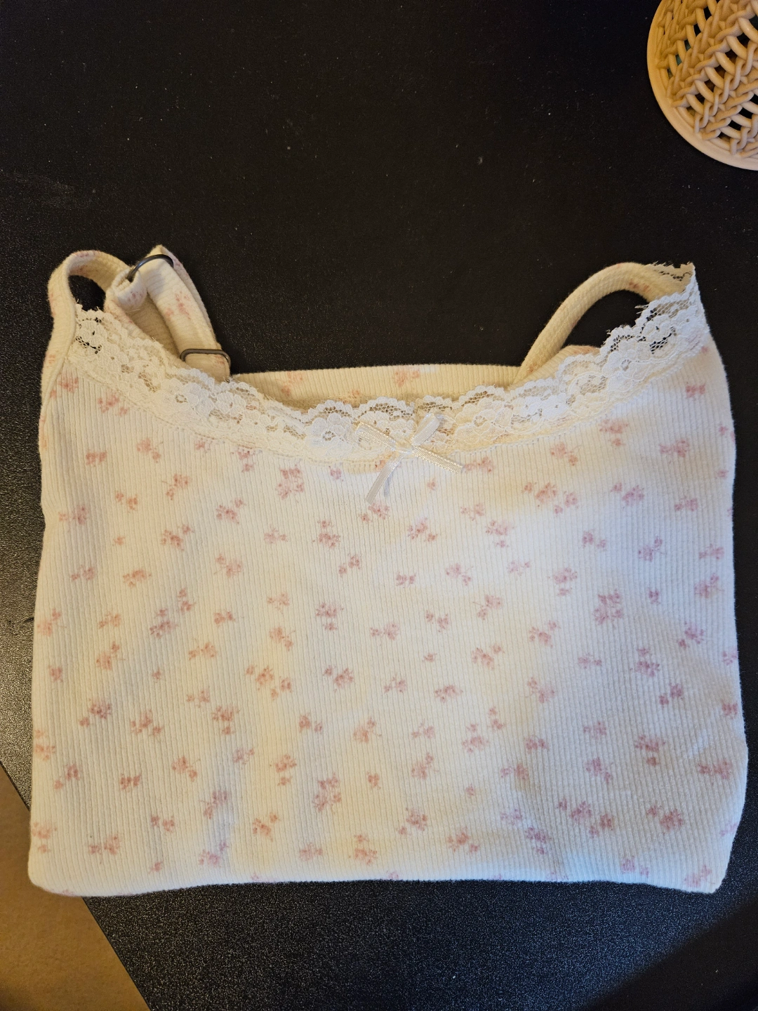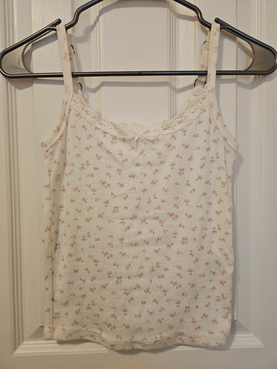 Cream-coloured cami top. Features a delicate floral print and lace trim. Size XS Long. Payment: Cash Meet up: Dovercourt park. ossignton or dufferin station! :)