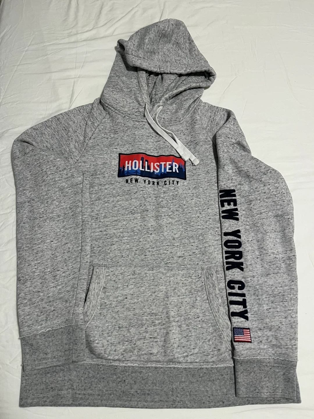 Selling a Hollister hoodie in grey with "New York City" on the sleeve. It's in great condition and super comfy for those chilly days!