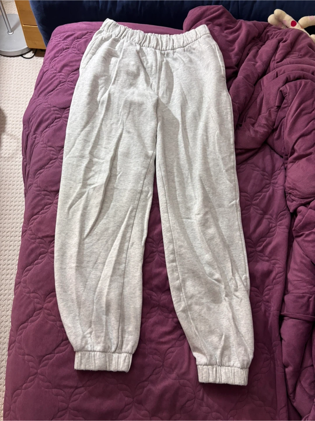 Selling a pair of light grey jogger pants. They look like a comfy fit for lounging around the house or running errands. They appear to be in good condition and ready for a new home!