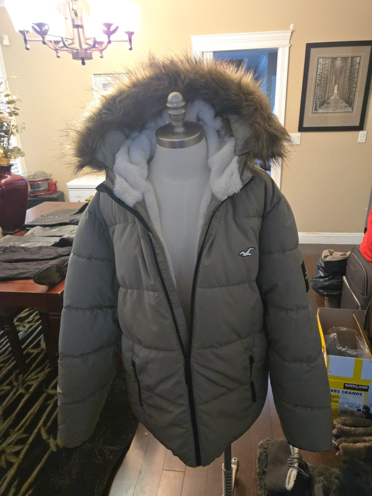 Brand New Green puffer jacket with faux fur hood. Size XXL. Has zipper and button closure. Lined with fleece.
