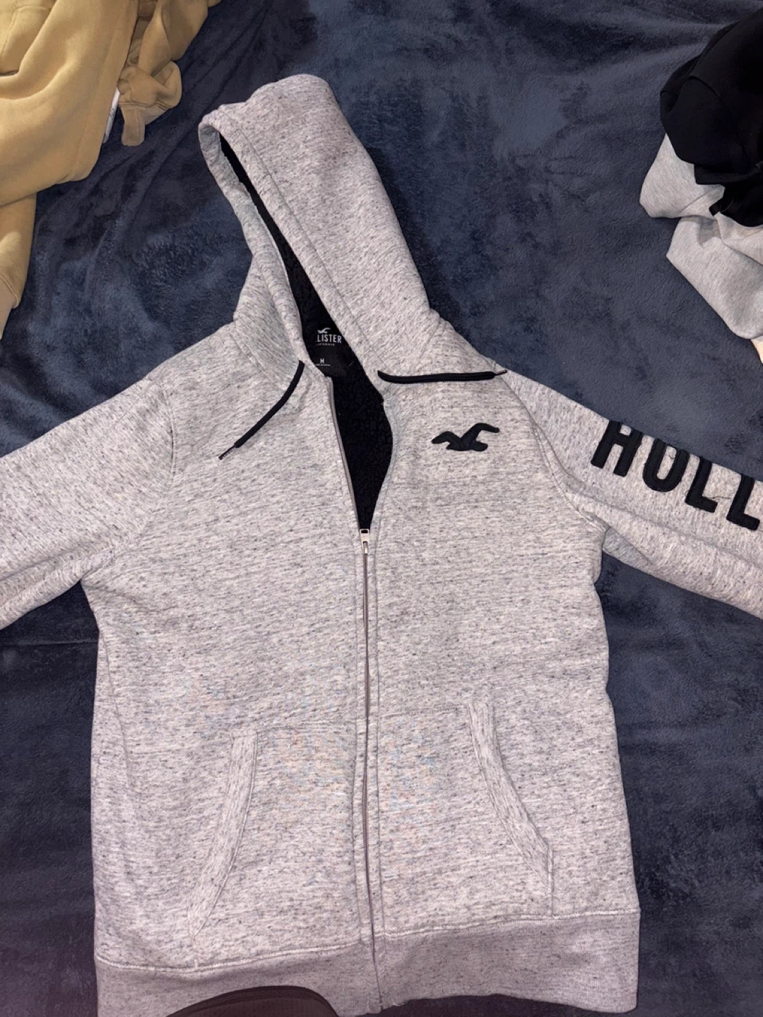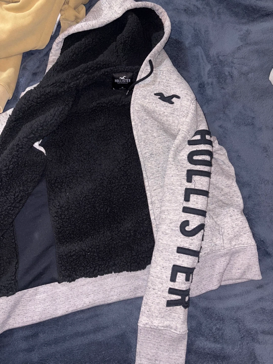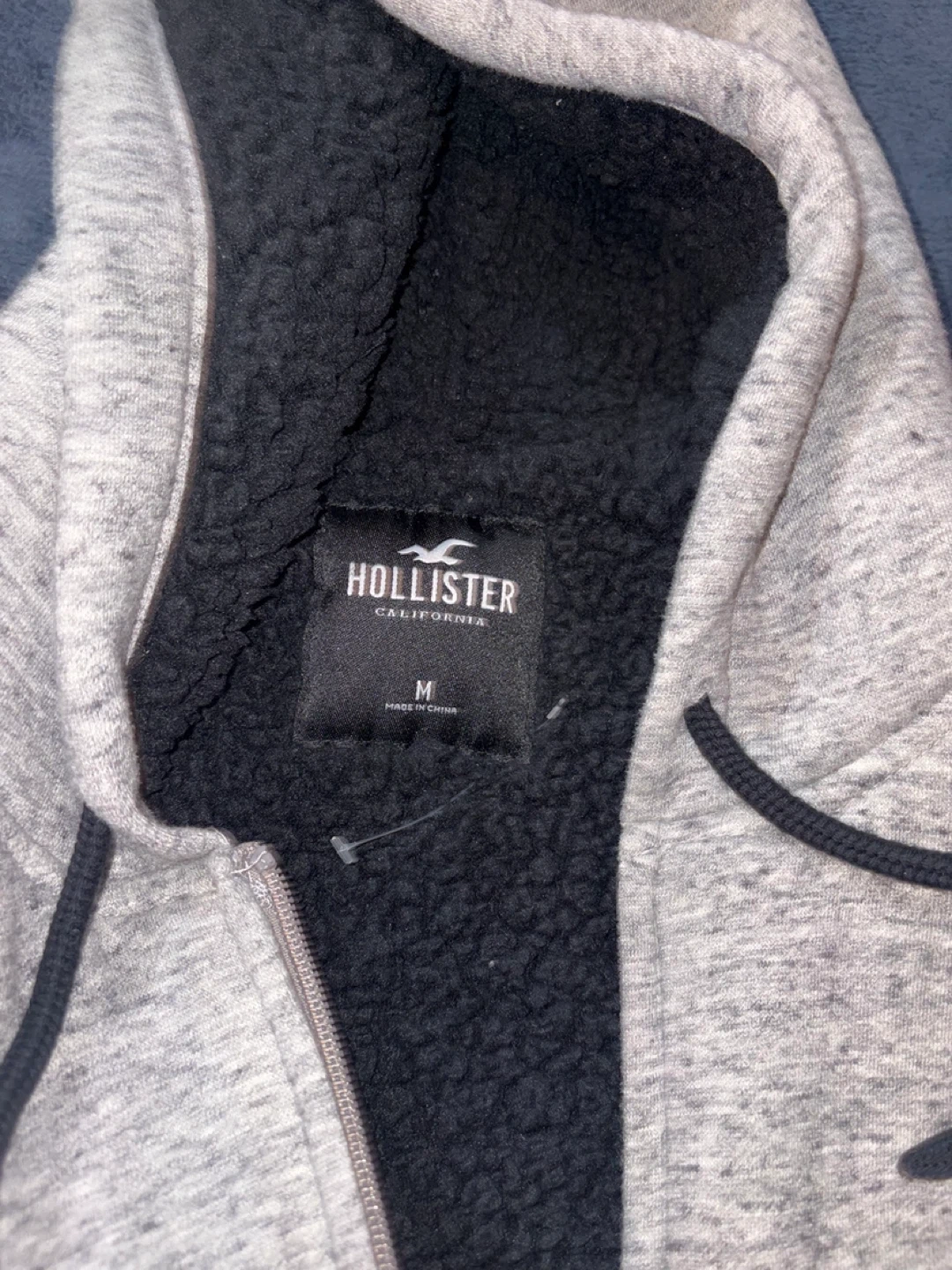 Cozy Hollister hoodie with a sherpa lining! It's a size medium and features the Hollister logo on the chest and sleeve. Perfect for staying warm on chilly days!