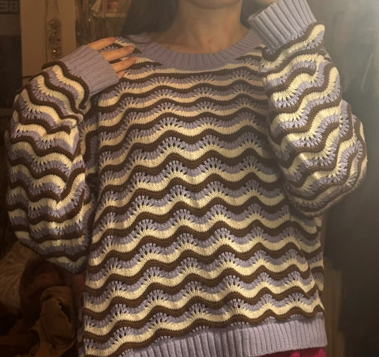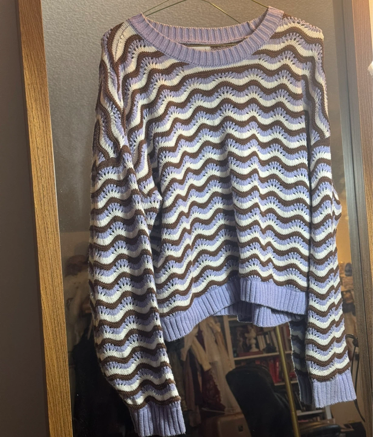Cozy knit sweater with a unique wave pattern in shades of blue, brown, and white. In excellent condition! Size large but could work on smaller sizes too. $5 off for purchasing with another item!!! pickup in Burnaby! Moving out of BC soon, please check my other listings ๐ค