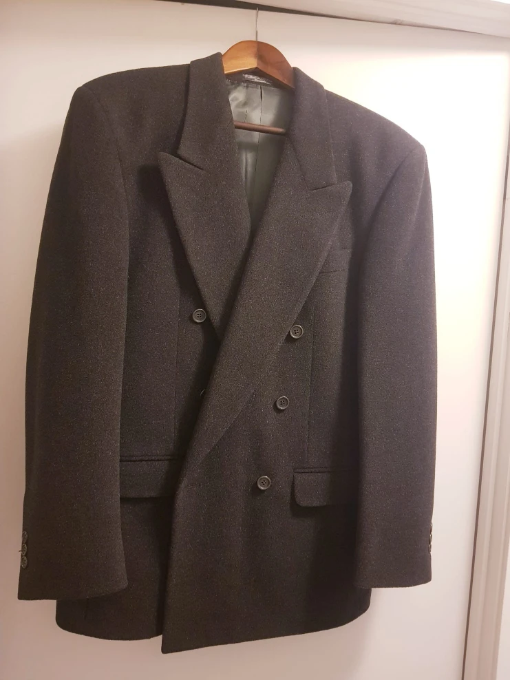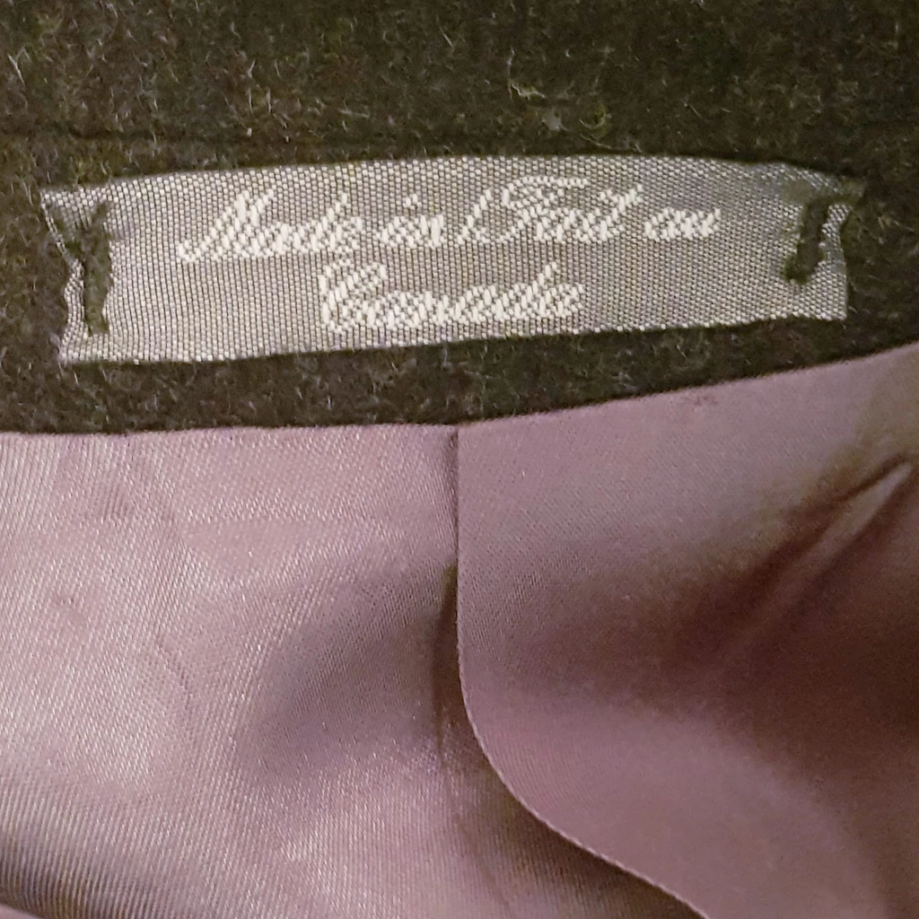 Made in Canada, 80% Wool, Double breasted with four buttons, has two pockets on the front and two inside pockets.