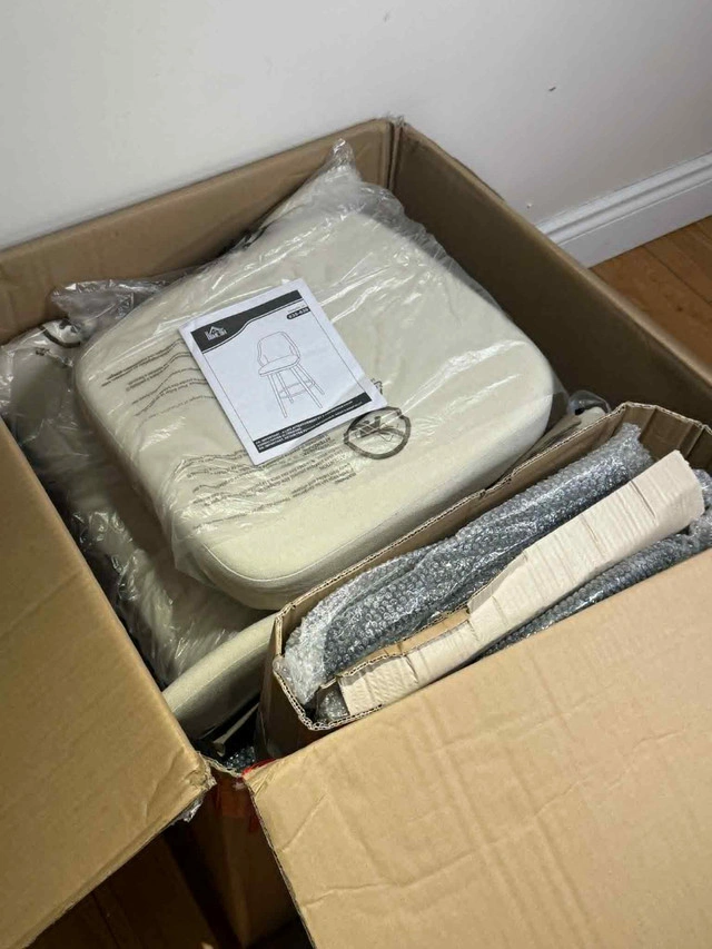 Add a clean modern look to your kitchen or dining space with this set of 2 HOMCOM bar stools — stylish, tall, and super comfortable. Set of 2 360° swivel seats. Cream white fabric w/ foam padding. Black steel frame w/ footrest. Non-slip feet protect flooring. Size: 18.25" W x 19.25" D x 42.25" H. Holds up to 264 lbs each. Assembly required. New open box — inspected, appears unused. Note: All items have been opened and visually checked. They appear to be new. However, if you experience any issues or notice a missing piece, please contact us. We're happy to resolve it with a partial or full refund where appropriate. Thank you. Contact: Message directly here or call/text 289-788-8085 with any questions — happy to help. Looking to grab a few things? Ask us about bundle discounts.