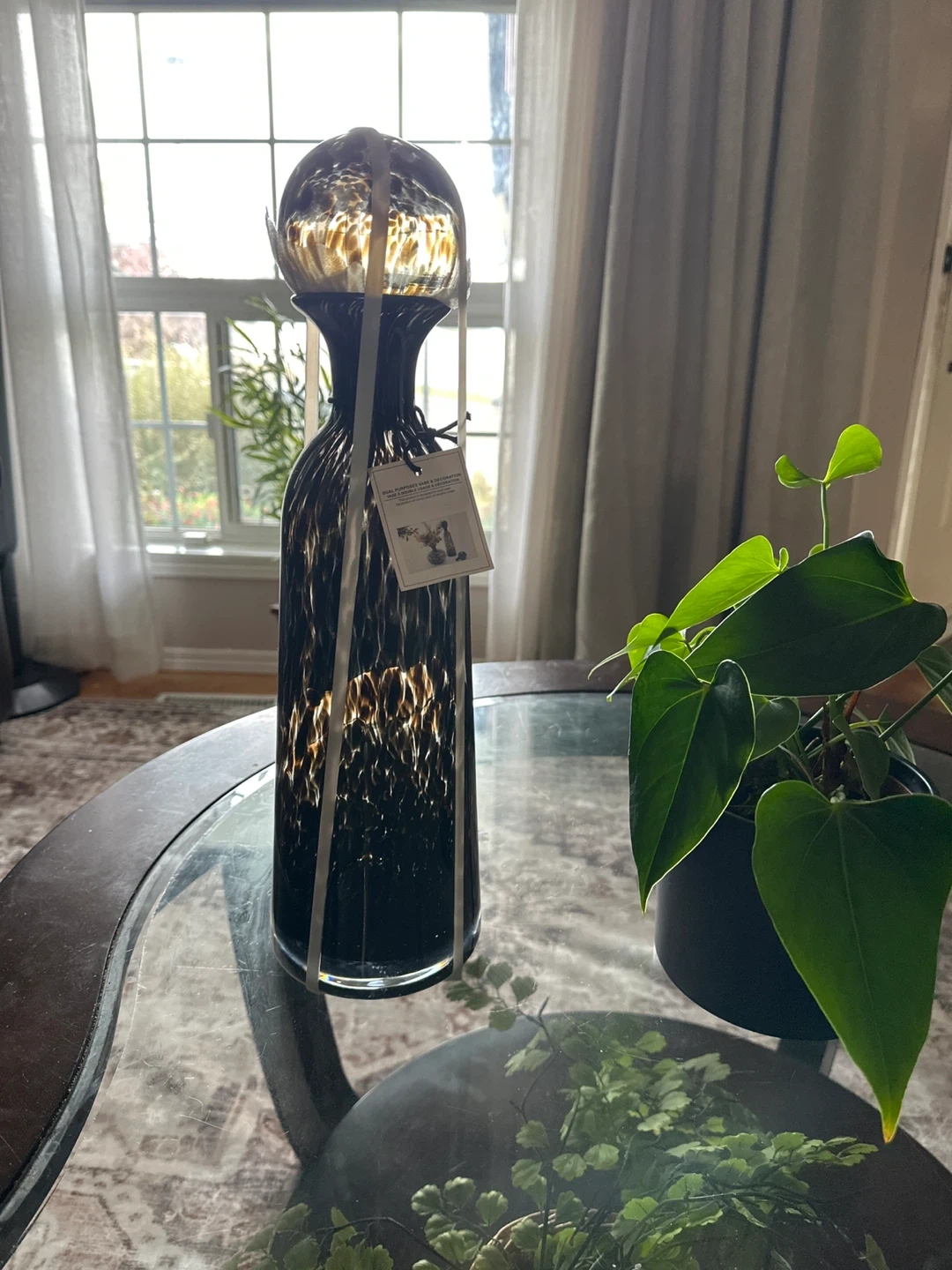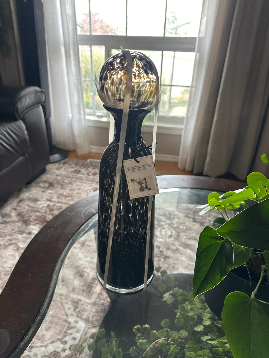 Selling a beautiful glass vase for home décor. It features a unique design with a spherical top and a sleek, elongated body. The vase has a dark colour with a mottled pattern that adds a touch of elegance to any room. Perfect for displaying flowers or as a standalone decorative piece!
