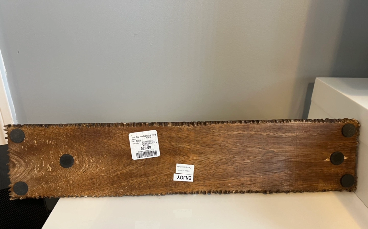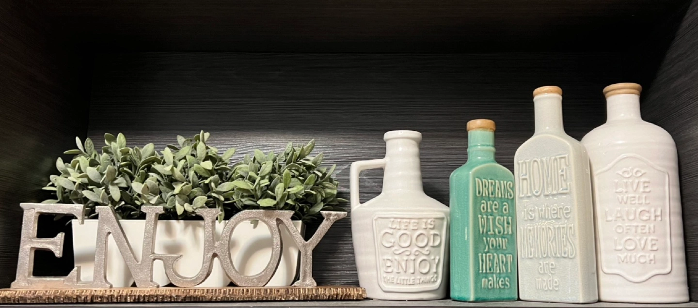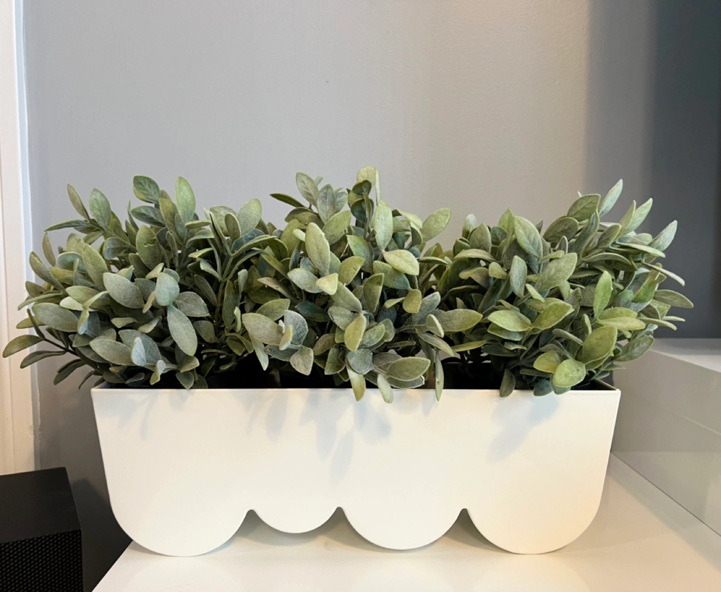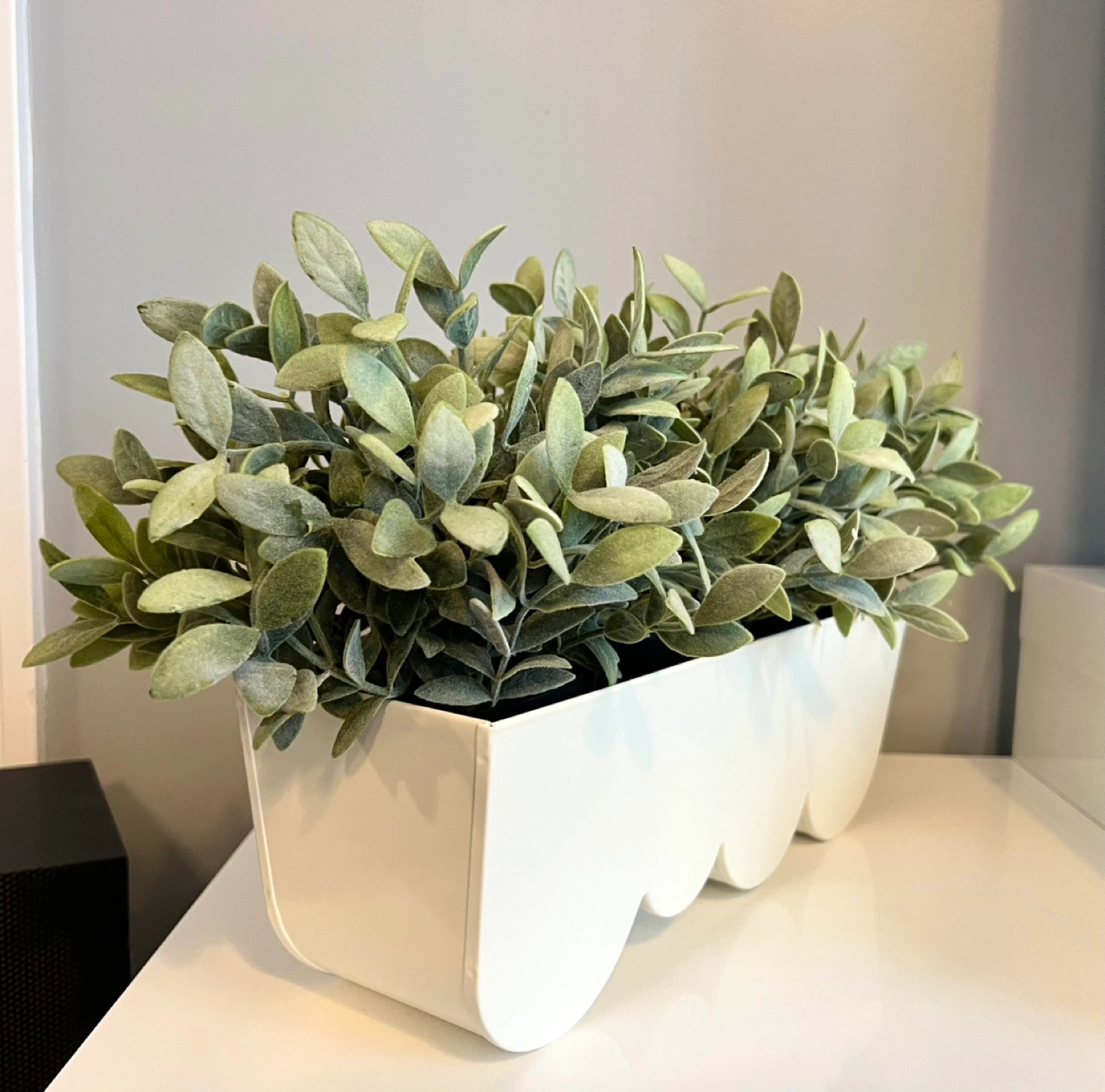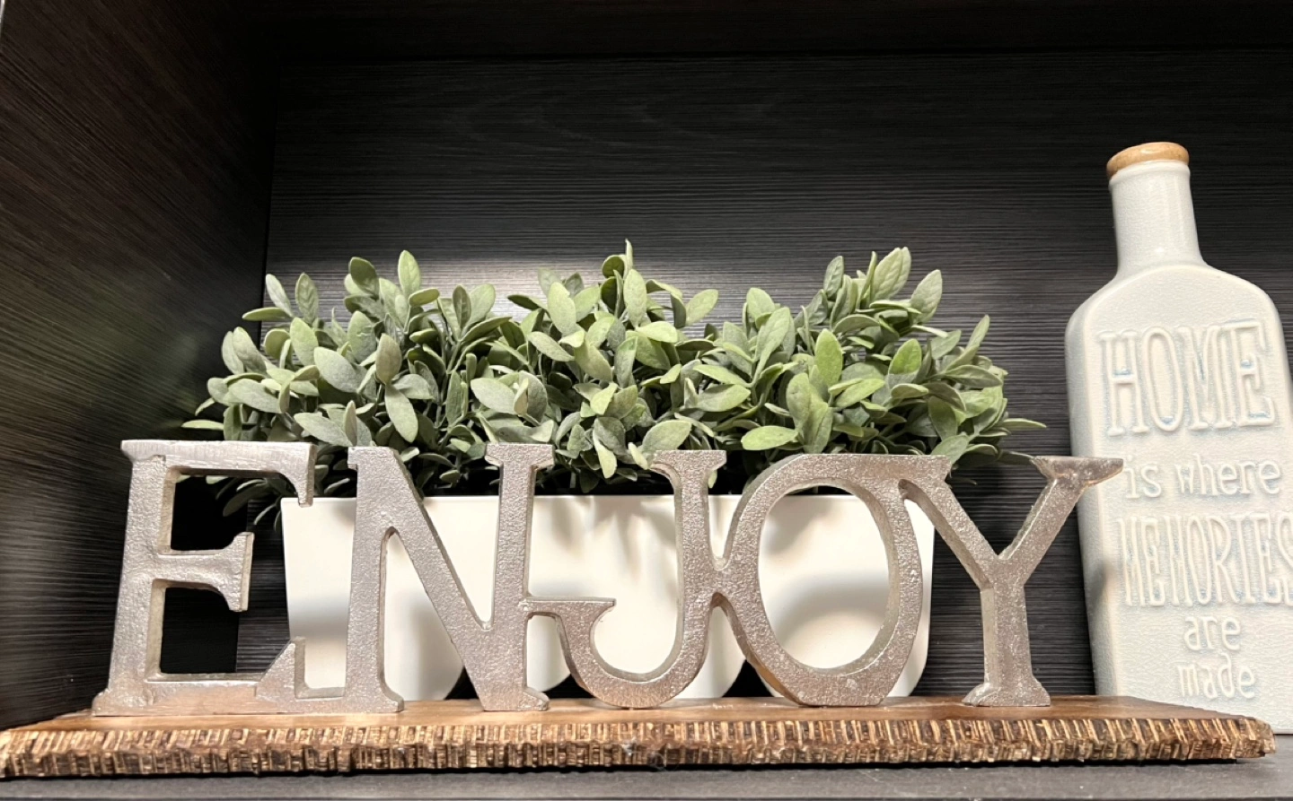 Silver metal letters “ENJOY”. Mounted on a rustic wood base. Perfect for home decor. Planter with 3 pots of artificial plants. All sold together. Condition: New Dimensions: “Enjoy” piece 49.5cm x 13.5cm Planter 34cm x 12cm