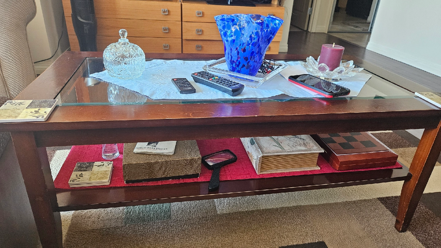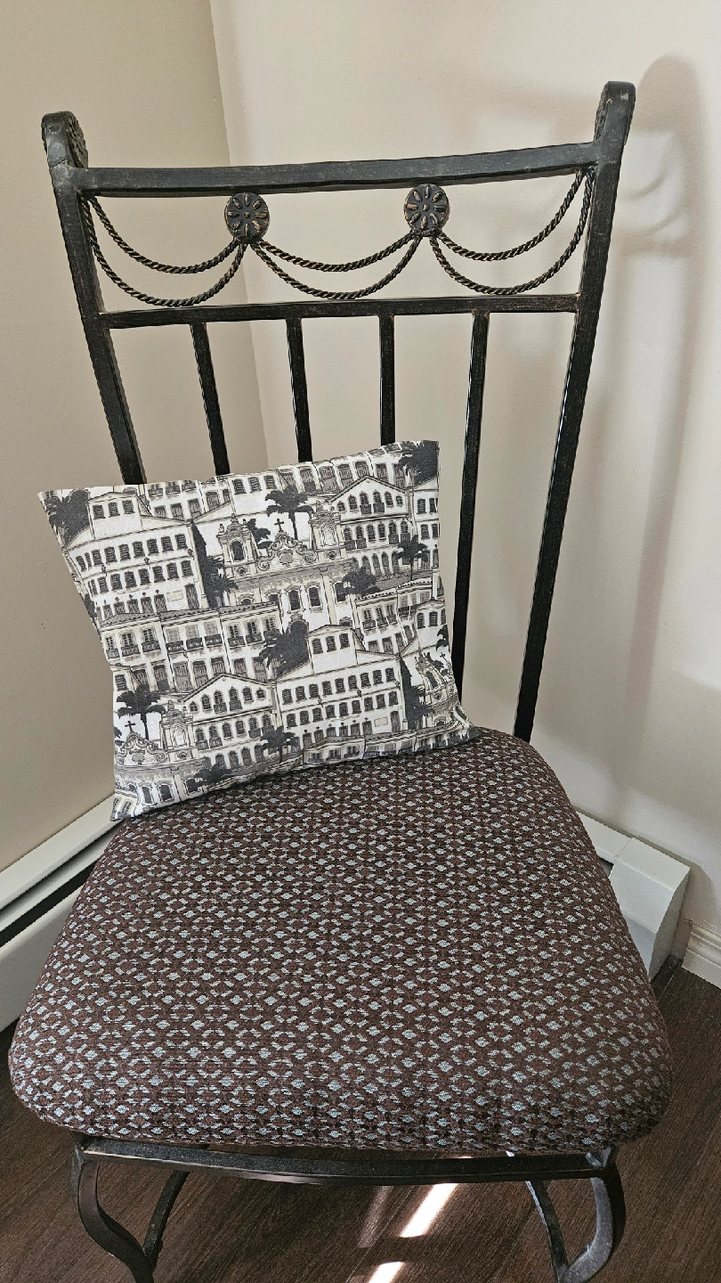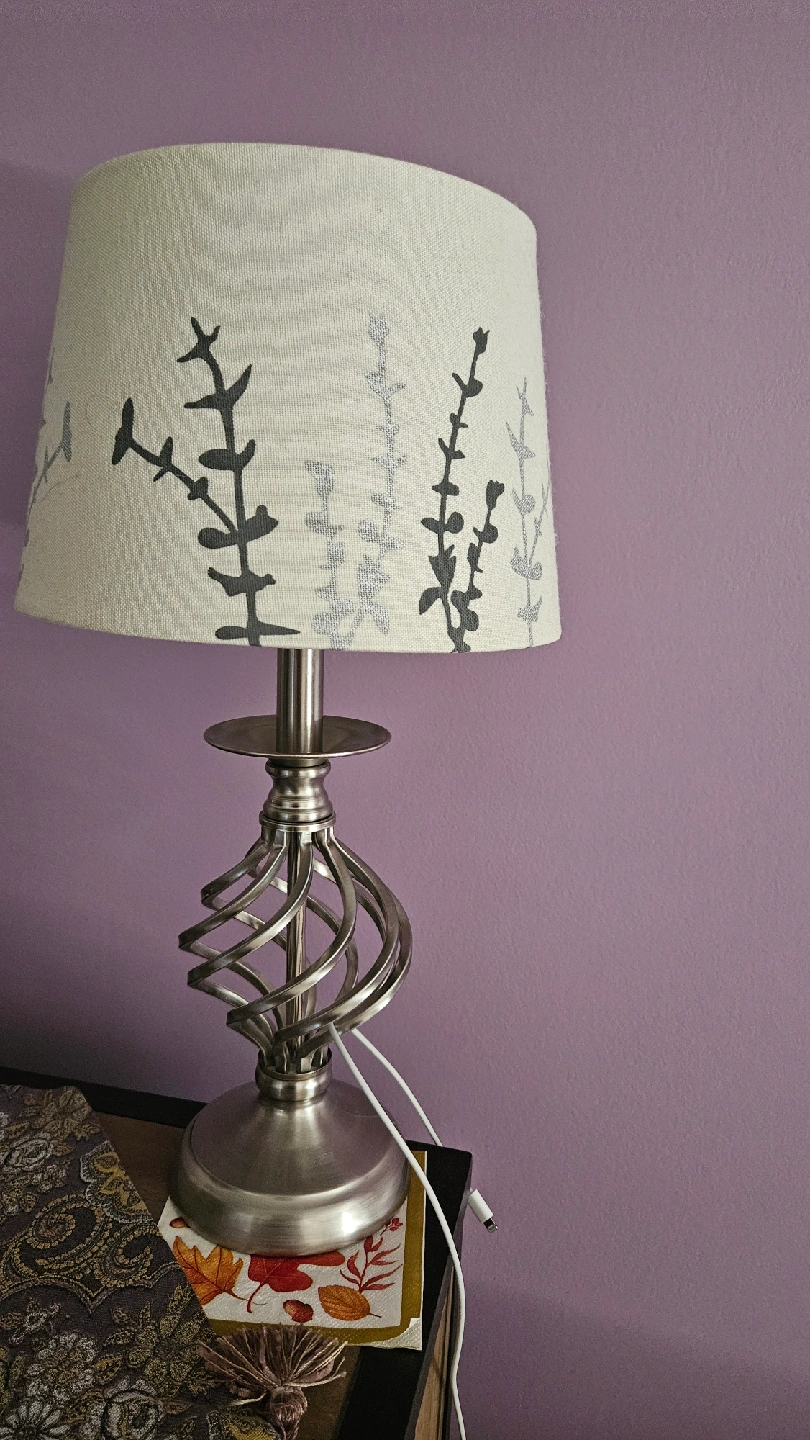 Selling a collection of home decor items! Included are 2 table lamp with a patterned shade and a silver-tone base, a black standing fan, a decorative pillow with a building print, a metal chair and a coffee table with a glass top and wooden frame.